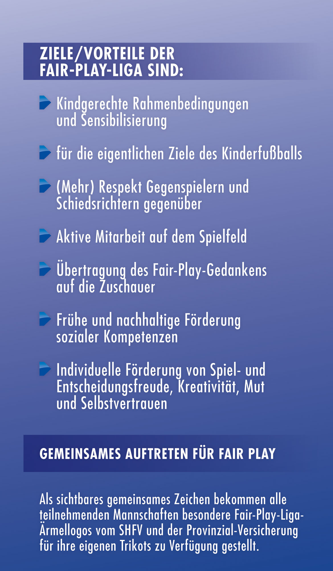 Nachdem in verschiedenen Kreisen des Schleswig-Holsteinischen Fußballverbandes bereits sehr gute Erfahrungen mit der Fair-Play-Liga im F-Jugend-Bereich gemacht wurden, hat sich nun endlich auch der KFV Kiel entschlossen, dieser Idee zu folgen. Hier sind die wichtigsten Infos mit der Bitte um Beachtung und Unterstützung dieser neuen Spielform: