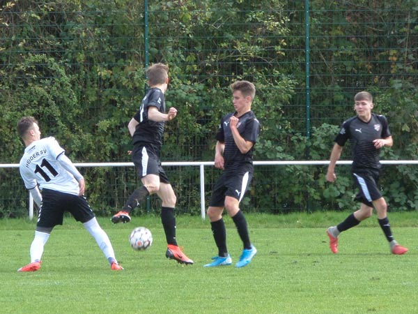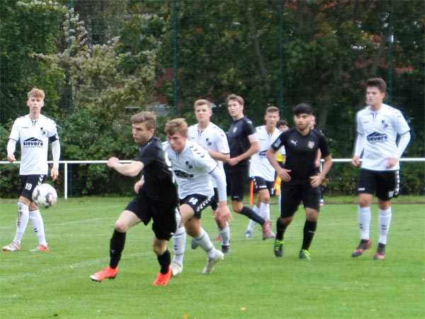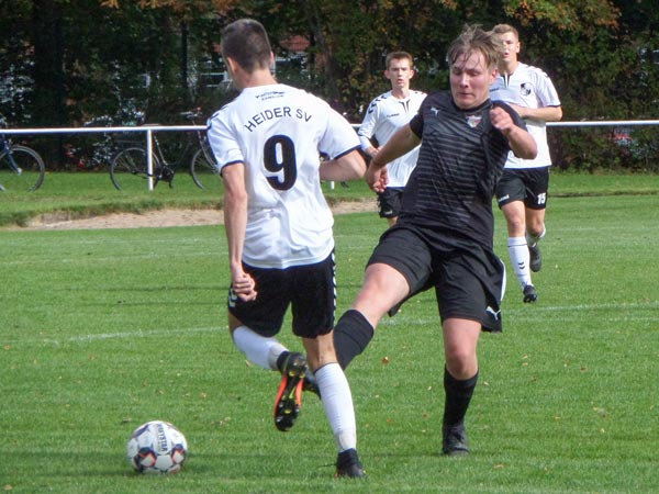 22. Minute: Der Heider SV belohnt sich für eine bis dato gute Vorstellung. Nach einem Durcheinander in der Abwehr bekommt der Stürmer den Ball im 16-er serviert und lässt Kevin mit einem platzierten Schuss in die linke Ecke keine Chance. 1:0 für die Gäste.