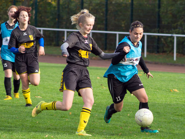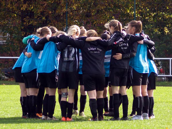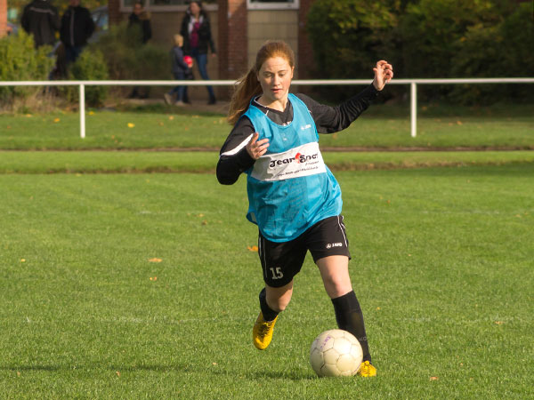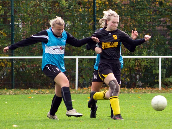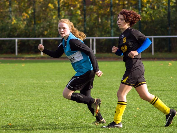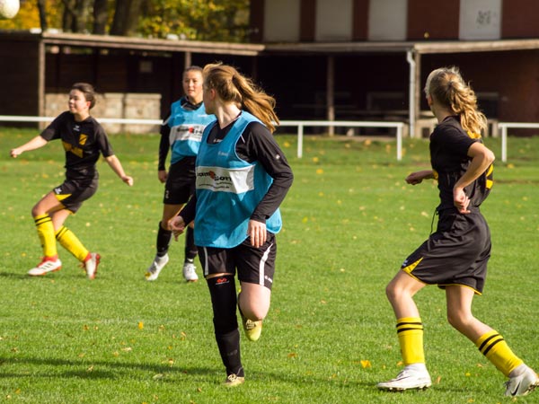 Wir starteten sofort überlegen und drängten die Gäste hinten rein. Nachdem wir die ersten Chancen liegen gelassen hatten, fingen wir uns gleich beim ersten gegnerischen Konter ein unnötiges Gegentor ein. Da sahen wir in der Rückwärtsbewegung nicht gut aus. Das veränderte das Match nicht, weiter stand der Gegner sehr tief und versuchte mit langen Bällen zu kontern. Ein ums andere Mal rannten wir uns in der dichten Abwehr fest oder agierten beim Torabschluss zu ungenau. So dauerte es bis kurz vor der Halbzeit, bis wir unsere Überlegenheit doch noch in zwei Tore ummünzen konnten. Zuerst fing Lea einen Spielaufbauversuch der Gegnerinnen ab und ließ sich alleine vor dem Tor die Chance nicht entgehen. Dann setzte Annika Kiara zentral in Szene, die zur Führung einschoss.