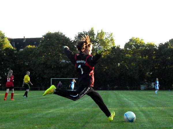 Das Spiel begann für uns sehr unglücklich, als kurz nach Spielanpfiff ein zu kurzer Abwehrversuch direkt als Bogenlampe über Joana ins Tor flog. Dies tat unserem Spiel nicht gut und wir sahen uns oft in der Abwehr gefordert. Nach 14 Minuten das 0:2: Wir standen auf der rechten Abwehrseite nicht gut und mit einem Pass zwischen Außen- und Innenverteidigerin kam eine Spielerin frei aufs Tor zu. Den Schuss konnte Joana abwehren, doch der abgewehrte Ball prallte noch einmal unglücklich gegen die Stürmerin und von ihr ins Tor. Nach 20 Minuten drehte sich langsam die Partie und wir kamen immer besser ins Spiel. In der 28. Minute brachte uns Luna wieder ran. Mit einem tollen Pass bediente Friederike Luna, die alleine vor dem Tor zum Anschlusstreffer einschoss. Leider ließen wir weitere gute Chancen liegen und gingen mit 1:2 in die Pause.