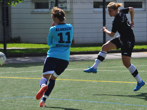 Das 1:0 für uns fiel nach der Pause, als Lisa die Hereingabe von Nicole zunächst noch nicht an der Torfrau vorbei bringen konnte, im Nachschuss jedoch sicher war. Nach zuvor drei verspielten Aktionen musste war der Treffer auch fällig. Bramfeld agierte weiter ohne durchzukommen, bis zur 67. Minute. Einmal nicht gut verschoben und die Lücke für M. Albrecht war gegeben. Das 1:1 – aber alles war noch im grünen Bereich. Ehe sich die Gegnerinnen versahen, bekam Dori das Zuspiel von Carolin und versenkte den Ball zur erneuten Führung. Eine Ecke sollte den Bramfelderinnen das 2:2 bescheren. Und dabei blieb es bis zum Ende.