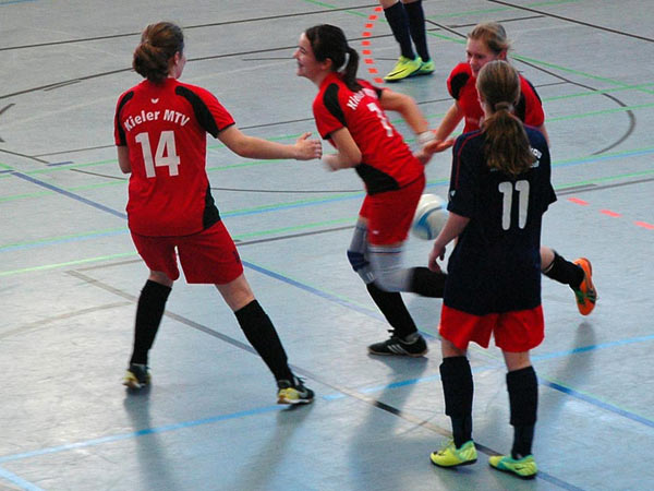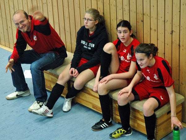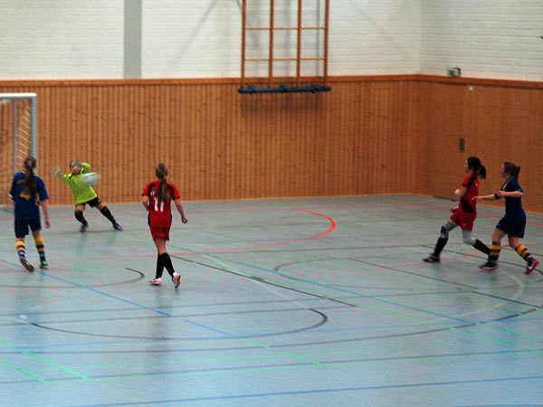 In unserer dritten Begegnung trafen wir auf einen der Turnierfavoriten, den TSV Ratekau, frischgebackener Hallenkreismeister Ostholstein/Lübeck. In den zwei vorangegangenen Spielen war vor allem die gegnerische Sturmführerin Kila auffällig und wurde nun von Luna besonders in Augenschein genommen wurde, was weitestgehend gelang. Es entwickelte sich eine spannende Partie, in der wir zweimal in Führung gehen konnten. Die spielentscheidende Szene passierte 90 Sekunden vor Schluss. Wir hatten an der gegnerischen Strafraumgrenze mittig einen Freistoß. Dieser misslang leider völlig und führte durch einen Konter zum 2:2-Ausgleich für Ratekau. Die Mädchen schienen nun gedanklich und körperlich nichts mehr zuzusetzen zu haben und wir kassierten in der letzen Minute noch zwei Gegentreffer zum 2:4. Die Stimmung trübte sich weiter ein, weil sich Fidane am Zeh verletzte und nicht mehr weiterspielen konnte. Da waren es für das weitere Turnier nur noch sechs aktive Mädchen.
