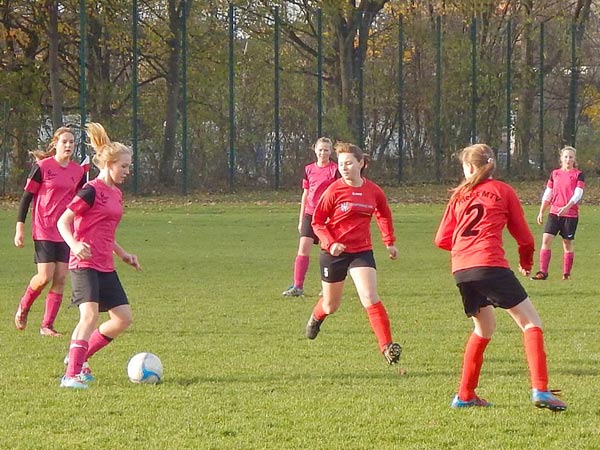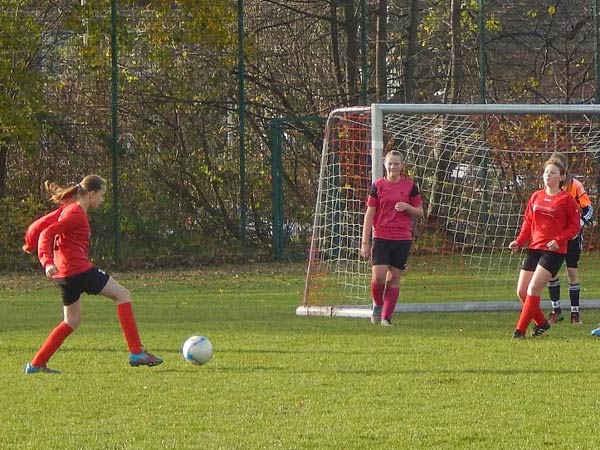 Die Spielanteile und Möglichkeiten blieben weiterhin mehr auf der Gästeseite. In nur acht Minuten wurde das Spiel gedreht und wir lagen plötzlich 1:3 in Rückstand. Beim ersten Gegentor bekamen wir einen Ball nicht aus dem Strafraum. Beim zweiten flog der Ball nach einer Ecke an allen vorbei, bis eine Angreiferin einschießen konnte. Beim dritten Gegentreffer sahen wir in der Innenverteidigung nach einer Flanke von links nicht gut aus. Zu allem Überfluss musste unsere Kapitänin Hannah, die schon von Übelkeit geplagt die Partie begonnen hatte, nun ganz passen. Da die Ersatzkapitänin Hanna H. verletzt erst gar nicht mitspielen konnte, übernahm Justina die Binde und die Rolle als Abwehrchefin. Im weiteren Fortschreiten der Halbzeit verflachte das Spiel und beide Teams konnten aus den sich trotzdem bietenden Chancen kein Kapital schlagen.