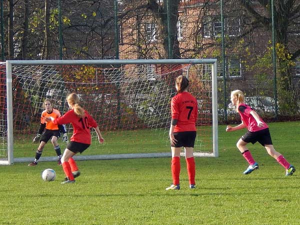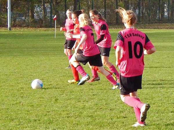 Die Partie begann mit einer zurückhaltenden Heimmannschaft und ersten Torannäherungen des Gegners. Unsere erste große Chance im Match war gleich drin. Lynn erkämpfte sich im zentralen Mittelfeld den Ball, spielte auf die Sturmspitze Finja, die seitlich zurückklatschen ließ. Lynn, die mit Tempo nachgerückt war, hatte einen Geschwindigkeitsvorteil, war plötzlich an allen Abwehrspielerinnen vorbei und sprintete Richtung Tor. Hart bedrängt, blieb sie robust am Ball und schob ins Toreck ein. - Das sah doch genauso aus, wie in der Trainingseinheit am Donnerstag einstudiert.