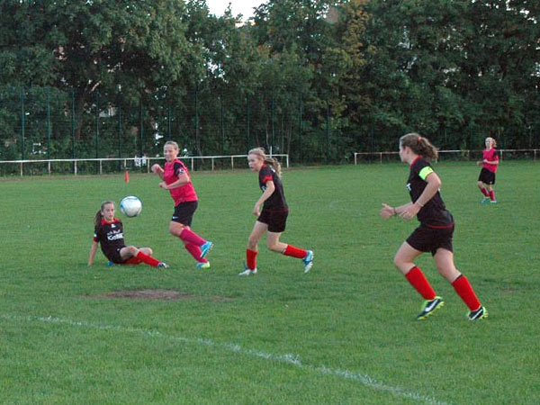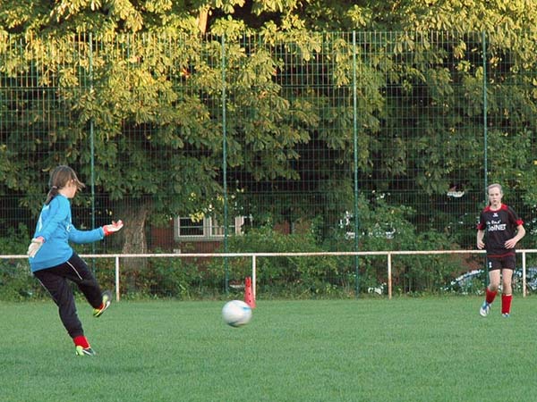 Da unser Heimspiel auf Bitte des Gegners auf unseren Trainingsdienstag vorverlegt wurde, hatten wir für ein 7er Spiel mit 13 Mädchen heute Spielerinnen "im Überfluss". Nach kurzer Absprache entschlossen wir uns, keine Mädchen beim gleichzeitigen D-Mädchentraining "zu parken", sondern die Einsatzzeiten zu verkürzen. Jedes Mädchen sollte in jeder Halbzeit für eine gewisse Zeit auf dem Platz stehen. Joana hütete leicht verletzt diemal das ganze Spiel über unser Tor.