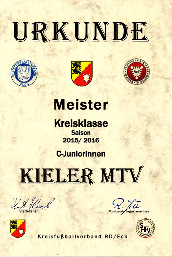 Vor dem Anstoß des letzten Punktspiels der Saison stattete der Mädchenreferent des KFV Plön und Staffelleiter der kreisübergreifenden Kreisklasse KI/PLÖ/RD-ECK, Kurt Heuck den KMTV C-Mädchen einen Besuch ab. Er gratulierte den Mädchen zur Meisterschaft in der Kreisklasse und überreichte die Meisterschaftsurkunde, ein Plüschtier für die Torhüterin und Naschis für alle. Der Kieler MTV bedankt sich bei Kurt Heuck für die Aufmerksamkeit und gratuliert der Mannschaft und Trainer Alex Still zum erfolgreichen Verlauf der Saison.