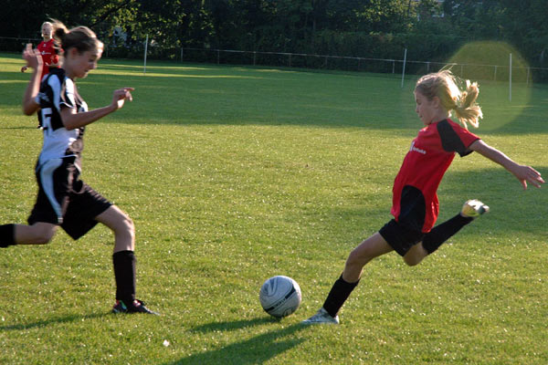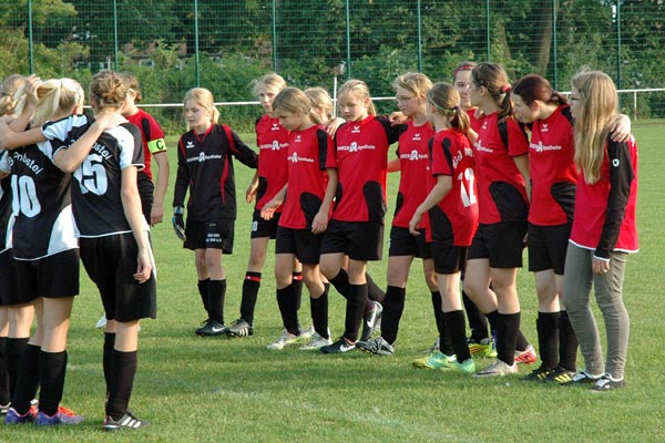 Die Mädchen begannen sehr konzentriert und spielstark. In der fünften Minute war es auch schon passiert. Kathi tankt sich über Linksaußen durch und passt in die Mitte, Phyllis rutscht der Schuss zu Hanna H. ab und es steht 1:0. In den nächsten Minuten klappte es trotz zahlreicher Chancen nicht mit dem Toreschießen. In Minute 17 brach Lynn den Bann und es folgten drei Tore bis zum hochverdienten 5:0-Halbzeitstand. Unsere Gäste kamen zu zwei Torgelegenheiten.