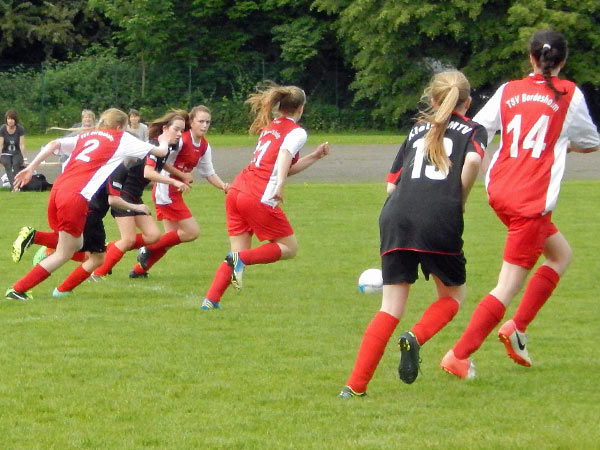 Fast über die gesamte zweite Halbzeit drückten wir die Bordesholmer Mädchen in ihre eigene Hälfte. Viele spielerische Highligts konnten wir trotzdem nicht setzen. Viel zu oft ging es durch die Mitte und die Flügel waren verwaist. Die Gegnerinnen suchten ihr Heil in weiten Befreiungsschlägen und Kontern. Bis auf eine Chance konnten wir alles abfangen. In der 51. fiel endllich der Ausgleich. Wir spielten einmal schnell über Rechtsaußen und Justinas Flanke schoss Hannah H. im Strafraum ein. Wir kamen noch zu einigen wenigen guten Gelegenheiten, doch das Glück oder Bente im Bordesholmer Tor waren gegen uns. So gelang uns nicht der finale Treffer und wir mussten uns mit einem Remis begnügen.