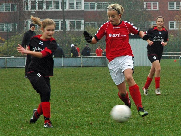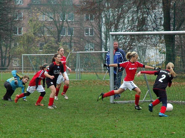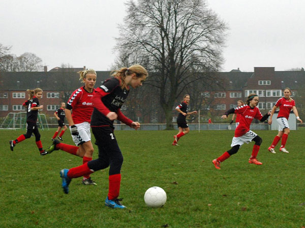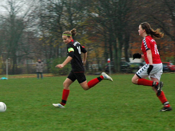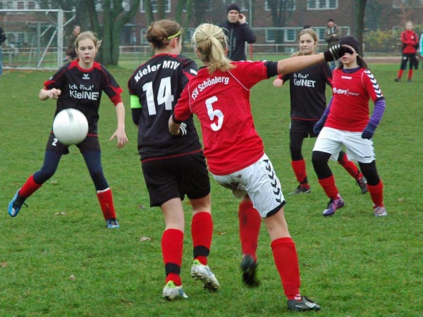 Mit dem TSV Schönberg war heute eine der Topmannschaften der Liga auf dem Prof.-Peters-Platz zu Gast. Nach den letzten durchwachsenen Auftritten von uns gingen wir als Außenseiter in die Partie. Davon war zunächst nichts zu merken. Wir spielten schnellen Fußball und kamen in den ersten 10 Minuten zu zwei Großchancen. Mehr als ein Pfostenschuss kam dabei leider für uns nicht heraus. Der Gegner machte es besser. Der erste gefährliche Angriff führte zum 0:1. Eine Schönberger Spielerin wurde auf halblinks steil geschickt und Luna schaffte es nicht mehr ganz, den Fuß vor den Ball zu bekommen. Damit nicht genug. Nur drei Minuten später führte ein unnötiger Querschläger in der Abwehr zum 0:2. Das Spiel ging nun hin und her mit Chancen auf beiden Seiten. Das Tor schoss dennoch wieder Schönberg. Ein missglückter weiter Pass aus unserer linken Abwehr landete bei der zentralen Schönberger Spielerin und sie vollendete zum 0:3. Mit diesem ernüchternden Ergebnis ging es in die Pause. Wir hatten bis jetzt ein gutes und ausgeglichenes Spiel gesehen, bei dem nur eine Mannschaft die gleichmäßig verteilten Chancen nutzte.