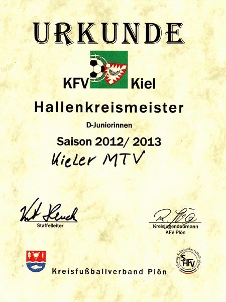 Im letzten Gruppenspiel trafen wir auf das bis zu dem Zeitpunkt ebenfalls verlustpunktfreie Team der SG PTSK/Holstein zu einem echten Endspiel. Schnell gingen wir mit 1:0 durch einen harten Schuss von Siska in Führung. Kurz kam der Gegner mit einigen Aktionen ins Spiel, von denen eine zum Ausgleich führte. Danach spielte nur noch der Kieler MTV und wir gewannen verdient mit 4:1. So können wir uns in der Hallensaison 2012/13 beste Kieler Mädchenmannschaft der Jahrgänge 2000 und jünger nennen.