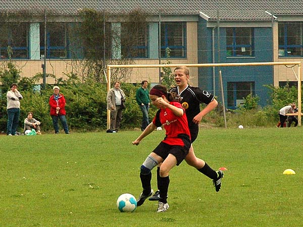 Unser Gegner im "Endspiel" der Gruppe A war zwar die eindeutig beste Mannschaft, auf die wir im bisherigen Turnierverlauf getroffen waren, doch wir gingen als Sieger aus der Partie hervor. Oldenburg hatte eine herausragende Spielerin, die unsere Abwehr beschäftigte, fand aber insgesamt nicht die Mittel, unseren Angriffen standzuhalten. Leider wollte der Ball wieder einmal nicht ins Tor finden, bis zum ersten Mal im Turnierverlauf die angeschlagene Luna in den letzten Minuten auf den Platz kam. Ihr war es vergönnt, den viel umjubelten Siegtreffer zu schießen. Wir standen im Endspiel. Nach dem Match bekamen wir zahlreiche Glückwünsche anderer Mannschaften, dem Seriensieger der Saison einmal eine Niederlage beigebracht zu haben.