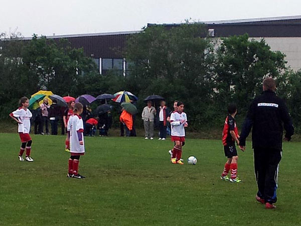 Sieben tapfere E-Mädchen erzielten bei strömendem Regen den dritten Platz beim Turnier des FC Wiesharde Handewitt.