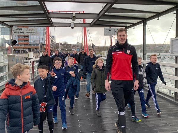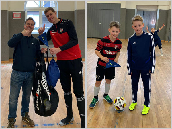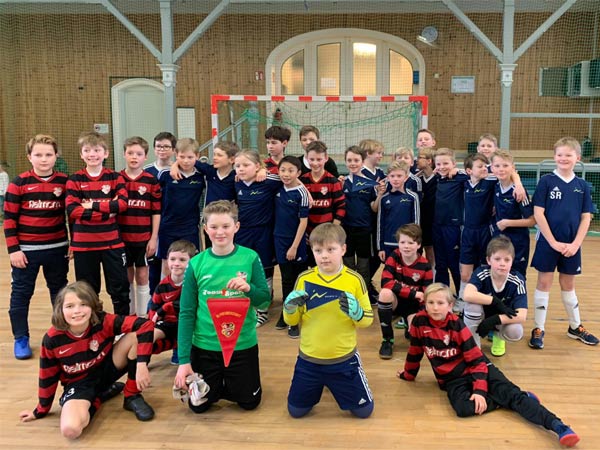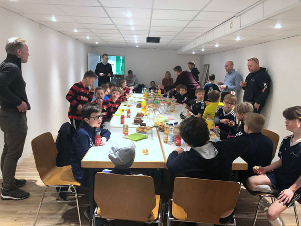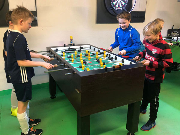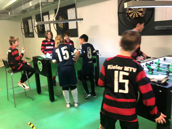 Wir teilten die Norweger und Kieler in Gruppen ein. Die einen absolvierten in einer 10-er Gruppe ein kleines kognitives und koordinatives Fitnesstraining (hiervon waren die norwegischen Trainer besonders begeistert), während die anderen Tischfußball und Twister spielten, sich am Büfett bedienten oder einfach nur entspannt haben. Nachdem die Halle 1 ab 12:00 Uhr frei wurde, konnten wir dann noch Mannschaftsfotos machen und abschließend in 3 Spielen mit 5 gegen 5 einen kleinen Leistungsvergleich durchführen, der in etwa auf Augenhöhe verlief und sich insbesondere durch tolle Stimmung der mitgereisten Spieler und Eltern sowie eine herausragende Fairness auszeichnete.