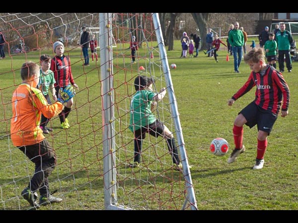 Doch wir wollten uns nicht verstecken und versuchten den Gegner von Anfang an unter Druck zu setzen. Nach ein paar ersten Annäherungsversuchen an das Tor vollendete dann Mio einen Angriff mit einem präzisen Schuss ins Tor zur 1:0-Führung. Einige Minuten später erhöhte Jost zum 2:0, nachdem der Ball von Lars (mit etwas Glück) zu ihm kam. Nachdem die Gegner bereits über Ecken gefährlich wurden, bekamen sie nun auch noch über Freistöße die Möglichkeit den Anschlusstreffer zu erzielen, da wir (zu) oft die Hand unerlaubter Weise zu Hilfe nahmen. So bekamen die Gäste kurz vor Ende der ersten Halbzeit einen Freistoß in vielversprechender Position, etwa 15 Meter zentral vor unserem Tor. Der Ball wurde länger und länger und schlug genau in den Winkel ein - keine Chance für Mattis im Tor. So ging es mit 2:1 in die Halbzeit.