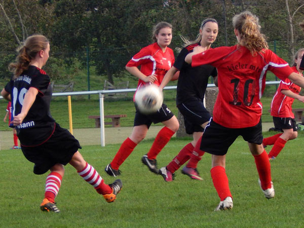 Besonders in der Passsicherheit hatten wir noch viel Luft nach oben und nahmen uns für den zweiten Durchgang einiges vor. Die Kieler Mädchen starteten sehr engagiert und druckvoll und kamen in den ersten 10 Minuten gleich zu vier guten Gelegenheiten, die allesamt nichts einbrachten. Danach verflachte das Spiel und man hatte den Eindruck, als ob alle 22 Spielerinnen mit dem Resultat zufrieden wären. 15 Minuten vor Ende wachten wir wieder auf und die letzte Viertelstunde gehörte nur noch uns. Wir erspielten uns eine Fülle von Torgelegenheiten, doch was wir auch anstellten, der Ball wollte – auch aufgrund der guten Leistung der gegnerischen Keeperin – einfach nicht ins Tor der Heimmannschaft.