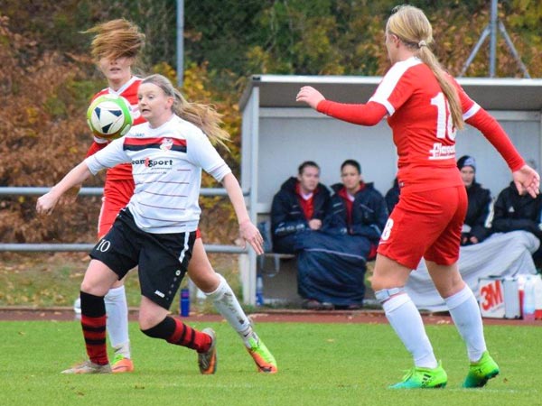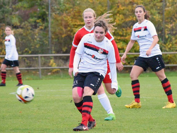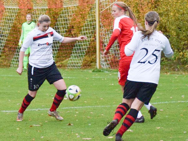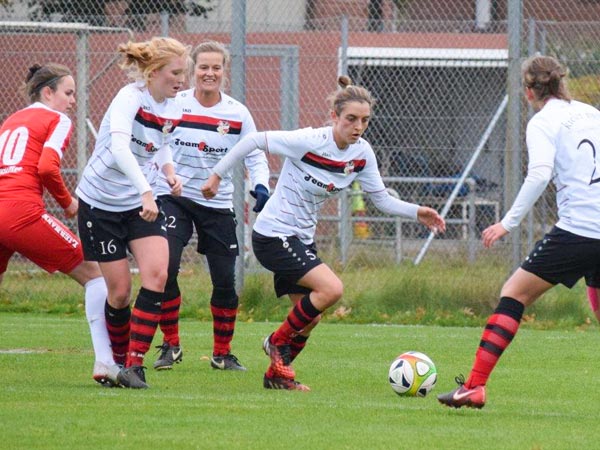Sehr ungünstige Voraussetzungen für uns, aber wir wollten natürlich dennoch Punkte mitnehmen. Druckvoll und motiviert agierten wir in Richtung Ratekau. Wir schoben sehr hoch und gingen auch ein gewisses Risiko ein. Ratekau hat die erste Gelegenheit, als sich Gieseler durchsetzen kann und verzieht. Nur zwei Minuten später setzt Maj mit einem 25-Meter-Schuss ein Zeichen, der gut pariert wird. In Minute 14 fällt dann das erste Tor: Wir versuchen nach einer Flanke in den Strafraum den Ball zu klären, doch schießt Nadine die gegnerische Stürmerin an. Der Ball springt so unglücklich, dass Sabeth ihn nicht mehr von der Linie retten kann. Auch beim 2:0 in der 23. Minute gab es ein ähnliches Bild: Der Ball kommt lang in den Strafraum und wir bekommen ihn nicht geklärt. Die Antwort lieferte Lefke allerdings prompt. Durch Stephanie in Szene gesetzt, kommt Lefke links im 16-er zum Abschluss und trifft zum 2:1-Anschluss. In der 28. Minute kommt Josepha über rechts und legt zurück auf Maj, die frei zum Schuss kommt, aber leider links daneben schießt. Nächste Chance nach Ecke für Jasmin, die knapp über das Tor köpft. Josepha kommt dann von rechts mit Zug in die Mitte und einem klasse Gassenspiel auf Carolin, die zum Abschluss kommt, aber ohne Erfolg. Nun hatte Ratekau noch die Gelegenheit, zwei Tore zu erzielen, was Sandra allerdings mit starken Paraden zu verhindern wusste. So ging es in die Pause. Bis jetzt war das Spiel recht ausgeglichen mit leichten Vorteilen für Ratekau, der Rückstand damit auch in Ordnung.