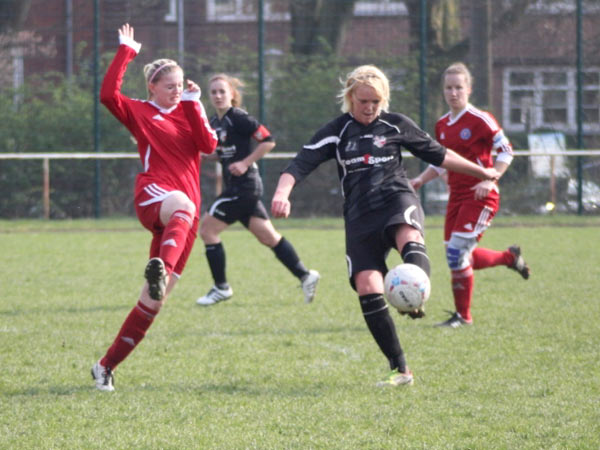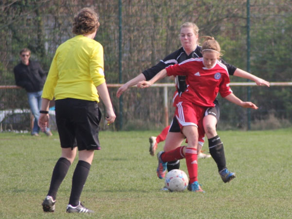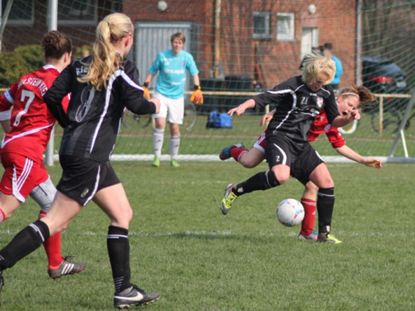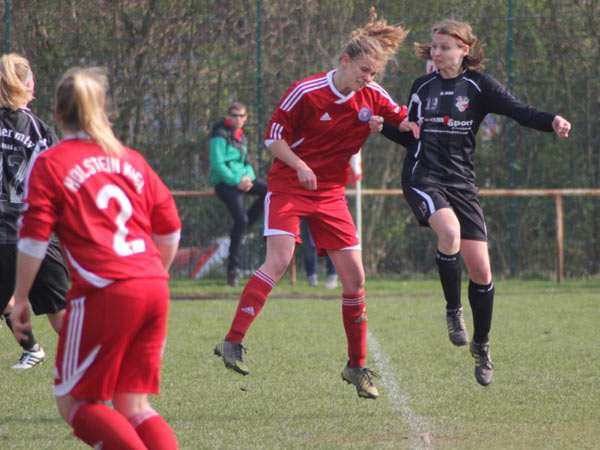 Wir schoben unsere Missstimmung über den zahlreichen Einsatz von Stammspielerinnen aus dem Regionalliga-Kader der Gäste erfolgreich beiseite und konzentrierten uns auf unser Spiel. Und das konnte sich sehen lassen! Wir versuchten die Räume für die spielstarken Holsteinerinnen sehr eng zu machen und spielten ein hervorragendes Pressing. Bei Ballgewinn ging es dann schnell in die Spitzen. Viele Chancen kamen in der gesamten Spielzeit nicht zustande, Holstein kam zweimal in Hälfte eins gefährlich vor unser Tor, wir hatten einmal die Führung auf dem Fuß. Zur Pause stand es 0:0 und wir durften schon jetzt sehr stolz auf unsere Mädels sein.