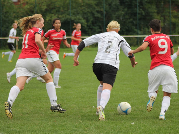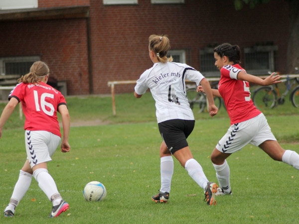 Heute waren die Mädels von Rot-Schwarz Kiel zu Gast auf dem PPP. Mit einem Sieg im Rücken gegen den FFC Oldesloe kamen unsere Gäste mit viel Selbstbewusstsein ins Spiel. Wir hatten 20 starke Minuten zu Beginn und konnten uns hochklassige Möglichkeiten durch Johanna S. (Lattenschuss) und Hannah (allein vor dem Tor) erspielen. Leider haben wir es nicht geschafft in Führung zu gehen und so kamen die Gäste mehr und mehr ins Spiel. Nach 30 Minuten musste Kim das Feld krankheitsbedingt verlassen und Laila kam zu ihrem ersten Einsatz im Trikot des Kieler MTV. Zwingende Möglichkeiten gab es keine weiter und so ging es in die Halbzeit.