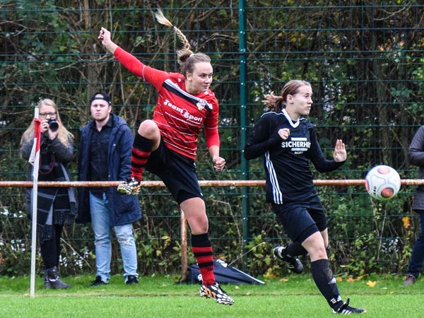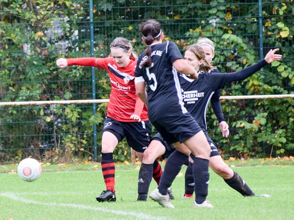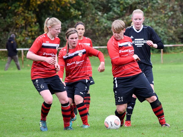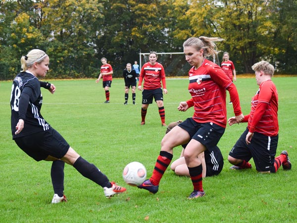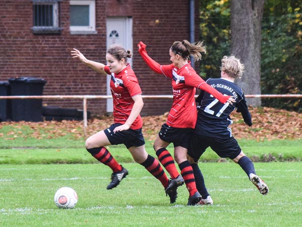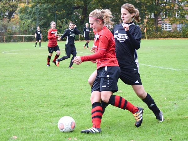 Dominant begannen wir die ersten Minuten und konnten nach einigen ansehnlichen Aktionen die erste große Möglichkeit für uns nutzen. Sandra spielt den Ball in den Lauf von Lefke, die eiskalt zur 1:0-Führung einschiebt. Viele starke Momente auf beiden Seiten zeigten die Damen, doch der Ausgleich sollte erst in der 31. Minute fallen. Eine Ungenauigkeit im Spielaufbau führte zum schnellen Konter, den Matthiessen aus 20 Metern zum 1:1 abschließen kann. Vor der Halbzeit markierte Celina nach einer Flanke per Direktabnahme fast die Führung und auch Nataljas Schuss aus 10 Metern vor dem Tor konnte klasse pariert werden. Rot-Schwarz hatte ebenfalls die Führung auf dem Fuß, als Dose nur die Latte traf.