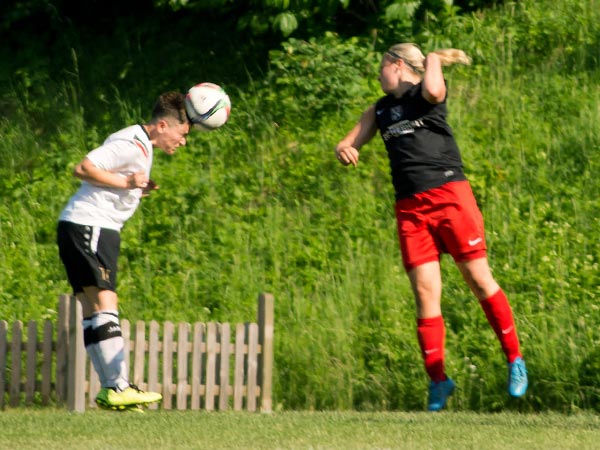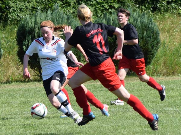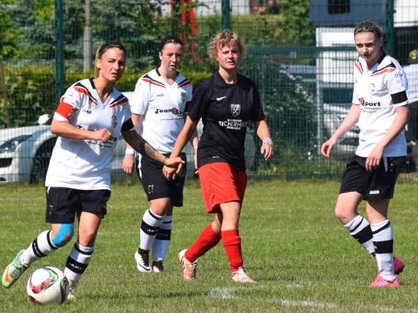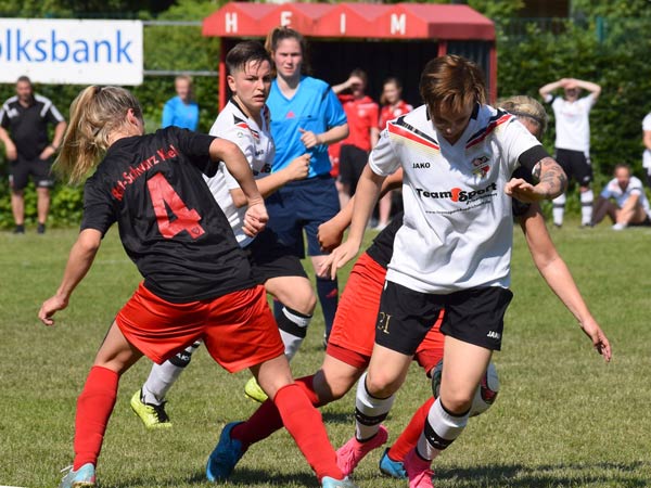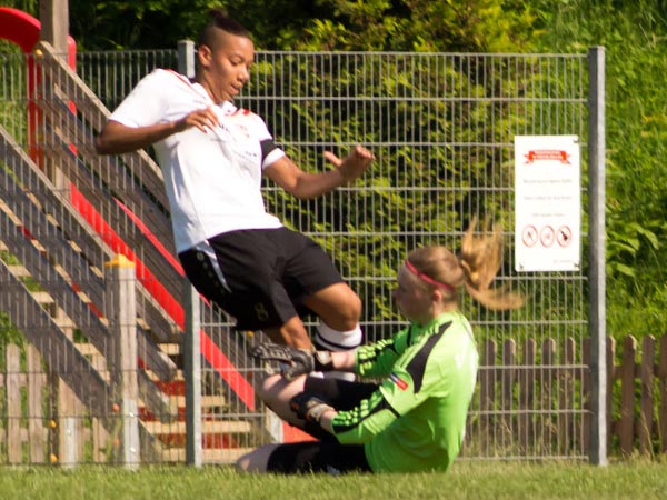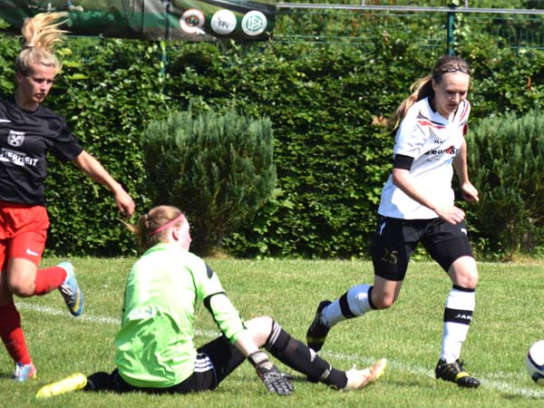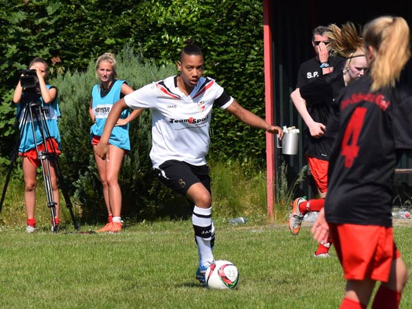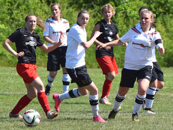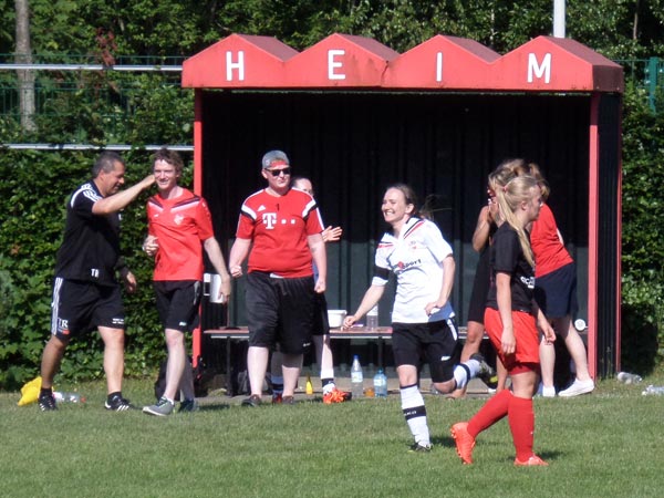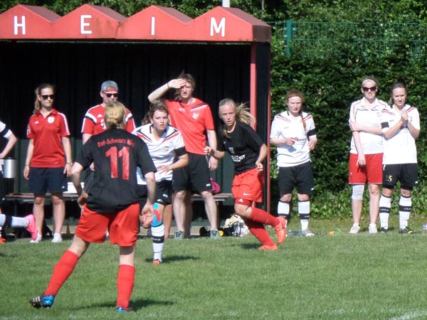 Das Spiel war von Anfang an sehr intensiv und beiden Mannschaften war ihre hohe Motivation anzumerken. Bei hochgradig sommerlichen Temperaturen mussten wir darauf achten, mit unseren Kräften zu haushalten. Torchancen wurden wenige herausgespielt, wir hatten Gelegenheiten durch Friederike und Seda sowie bei einem Abschluss von Stephanie und einer guten Aktion von Lisa. Nach der Trinkpause war es dann jedoch Lefke, die unser Team heute als Kapitänin in das Finale führte und das 1:0 erzielte – Lefke ging nach klasse Steilpass von Mittelfeldmotor Carolin zielstrebig Richtung Tor. Lefke war bei dieser Aktion nicht zu halten und nach einem Haken vor der Torfrau schlug der Ball dann im gegnerischen Kasten ein. Danach musste Lefke das Feld leider verletzungsbedingt verlassen – Dorit kam für sie ins Spiel (30.). Rot-Schwarz wurde nun immer stärker. Zweimal konnte Johanna parieren. Einen Ball lenkte sie überkopf an die Latte und einen an den Pfosten – klasse Form unserer Torhüterin! Den Ausgleich konnte Johanna in der 41. Minute jedoch nicht verhindern. Nach Ballverlust im Zentrum ging alles sehr schnell: Daria W. war durch und schob sicher zum Ausgleich ein. Dann war Halbzeit und alle waren froh über die willkommene Pause.