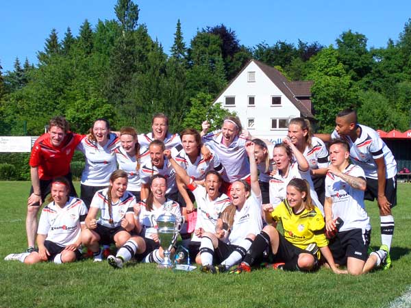 Auch in der zweiten Hälfte begannen wir druckvoller. Justine kam für Friederike und konnte einige Akzente im Sturm setzen. Ohne Torraumszenen ging es bis zur 66. Minute, in der es einen Freistoß für uns gab. Lisa und Carolin waren sich einig: Lisa hatte ein gutes Gefühl, was sich bestätigen sollte. Über die Mauer lenkte sie den Ball gefühlvoll in den Winkel zum 2:1. Beflügelt davon wollten wir nachsetzen und den Sack zu machen. In der 73. Minute war Seda durch, doch Köpke konnte parieren. Der Abpraller landete jedoch bei Justine, die sich nicht lange bitten ließ und zum 3:1 vollendete. Lange sollte die Freude aber nicht währen, denn nur drei Minuten später fiel nach Ecke der Anschlusstreffer zum 3:2. Wir kämpften beherzt weiter um den Sieg. Es waren noch 3 Minuten zu spielen, als Daria W. mit unserer Torhüterin Johanna zusammenprallte. Nach langer Unterbrechung folgte für Daria die Fahrt ins Krankenhaus. Gute Besserung an dieser Stelle vom Kieler MTV! Auch das letztmalige Aufbäumen der Rot-Schwarzen konnten wir überstehen und der Pokalsieg war endlich perfekt.