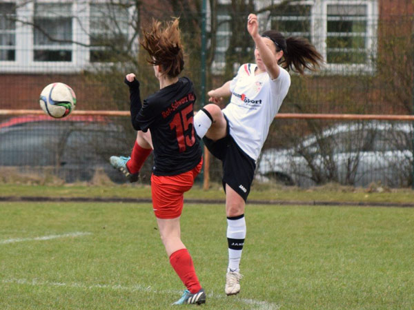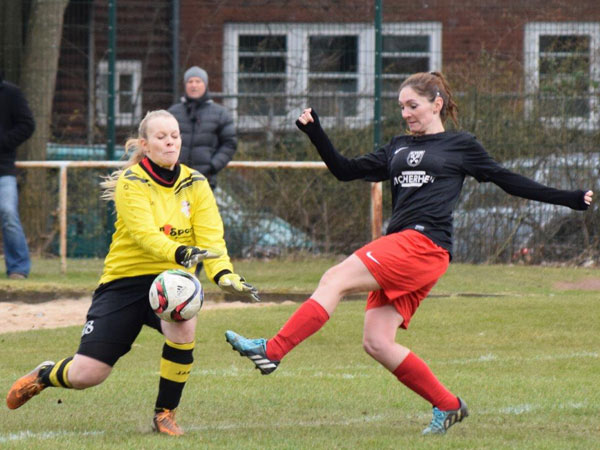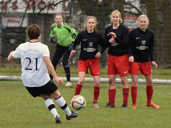 In der zweiten Halbzeit merkten wir den Kräfteverschleiß deutlich. Wir wollten dran bleiben und das laufintensive Spiel weiter betreiben. In den ersten Minuten kamen wir nicht gut ins Spiel. Rot-Schwarz – etwas mutiger – hätte bei einer Ecke den Ausgleich erzielen können, auf der Linie konnten wir jedoch klären. Zwei Torschüsse hielt Svenja fest, das war es auch schon an Chancen für die Gäste. Wir hatten ebenfalls einige gute Aktionen durch Sabeth, Stephanie und Lefke. Es war insgesamt jedoch kein sonderlich schönes Spiel. Rot-Schwarz Kiel hat keine spielerischen Akzente setzen können und wir wurden kraftloser und gingen nicht mehr mit dem Druck zu Werke, wie noch in der ersten Halbzeit. In der 90. Minute die sicherlich größte Chance nach Ecke von Lisa. Carolin nimmt den Ball mit der Brust an und schließt volley ab – Köpke pariert sensationell und bewahrt die Gäste vor einer höheren Niederlage.