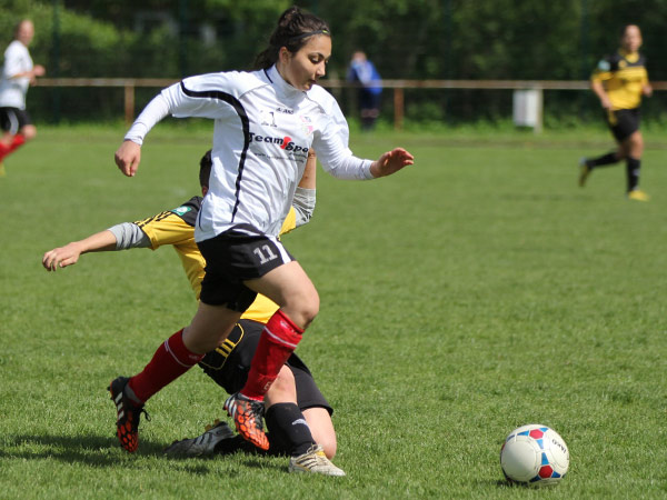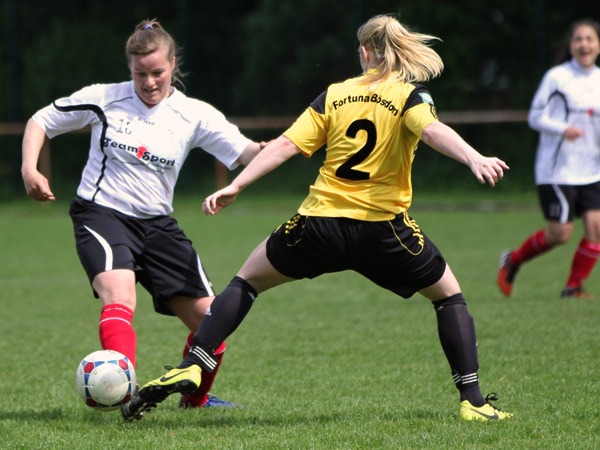 Das Spiel begann verheißungsvoll! Wir waren sofort drin und zeigten vor allem spielerische Klasse. Liliana testete die Gästetorfrau mit einem straffen Schuss und Sabeth traf nach tollem Offensivspielzug am Ende nur die Latte. Dorit setzte sich das eine ums andere Mal links außen durch und brachte gute Bälle ins Zentrum. Noch sollten wir die starke Jessika W. der Fortuna aus Bösdorf nicht überwinden können. Einige Leckerbissen durften die Zuschauer jedoch schon sehen, und in der Defensive waren wir super sortiert und konnten eine Vielzahl an Situationen spielerisch lösen. Gegen Nadine und Natalja ging außen für Bösdorf nichts und im Zentrum hatten Julia und Mona ihre Gegenspielerinnen meist im Griff. Die nächste klasse Chance verbuchten wir durch Natalja, die über links einen satten Schuss abgab, der schwer einzuschätzen war und von der Torfrau abprallte. Das war denkbar knapp! Alle stellten sich bereits auf die Pause ein, als Eda einen Ball von Julia in den Lauf von Dorit verlängert, die aus vollem Lauf ins lange obere Eck abschießt! Das war das mehr als verdiente 1:0 und gleichzeitig der Halbzeitstand.