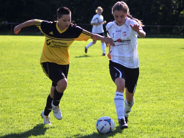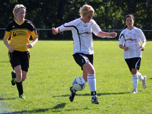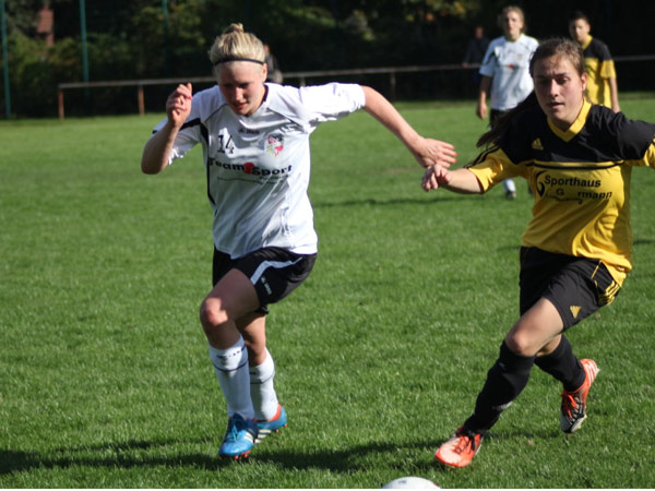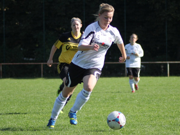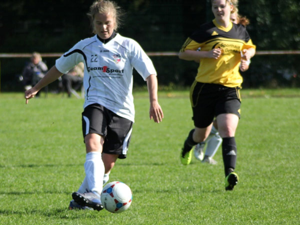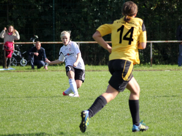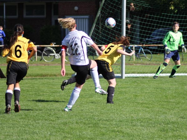 Wir mussten hinten heute etwas umstellen. So begann Sabeth für Kim auf der linken Seite und Svenja für Mareike auf der rechten Seite. Jasmin rückte zentral für Nicole wieder in die Startelf und Nicole ging auf ihre gewohnte Position in den Sturm. Zudem spielte Aila links außen wieder von Beginn an. Ordentlich durchgewirbelt, aber trotzdem gut sortiert begannen wir zielstrebig zu spielen. Die erste große Gelegenheit wehrte Jessica W. im Bösdorfer Tor vor Nicole im 1-gegen-1 noch ab. Doch schon in der 5. Minute verwertete Aila eine scharfe Hereingabe von Johanna S. zur 1:0-Führung. Es lief alles nach Plan und wir spielten über Finja und Dorit einige gute Aktionen heraus. Nicole und Aila scheiterten des Öfteren, und wenn man nicht nachlegt, wenn man die Gelegenheit dazu hat, werden eigene Fehler bestraft. Bis dato konnte Bösdorf keine Chance verzeichnen. Doch dann kam ein hoher Ball in Strafraumnähe, der von unserer Abwehr falsch eingeschätzt wurde, was die beste Bösdorferin Natalia G. zum Ausgleich nutzte (25.). Wir spielten bis zur 35. Minute sehr dominant mit vielen Möglichkeiten, doch dann kamen wir etwas ins Schwimmen. Bösdorf hatte nun seine beste Spielphase und zwei sehr gute Aktionen, die jedoch ungenutzt blieben.