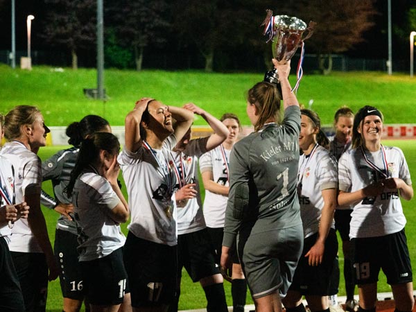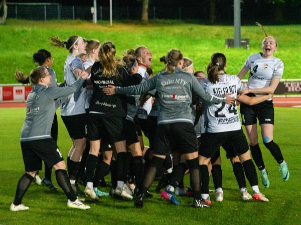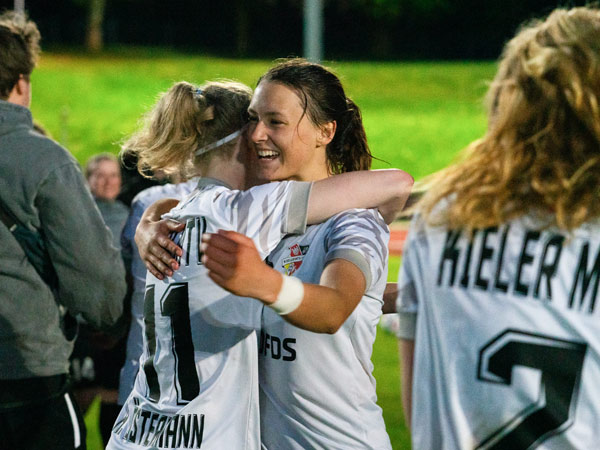 Nach regulärer Spielzeit stand es 1:1 (0:0), Torschützin zum 1:0 war unsere Kapitänin Hannah Ö. (58.). So musste die Entscheidung im Elfmeterschießen fallen. Gleich die erste Schützin des SVHU jagte das Spielgerät über das Tor hinweg, wir antworteten mit 4 sicher verwandelten Treffern (Emma J., Lina U., Annika M., Hannah Ö.) und ebenfalls einem Patzer. Den sechsten Schuss konnte unsere Keeperin Thyra halten, die Schiedsrichterin verlangte allerdings eine Wiederholung, die mit einem Lattenschuss missglückte. Nun hatte Annika A. die Entscheidung auf dem Fuß und verwandelte sicher zum vielumjubelten 6:5. Das ist ein historischer Erfolg für die Fußballerinnen des KMTV und für den gesamten Verein und bedeutet den Einzug in den DFB-Pokal – Wahnsinn!!!