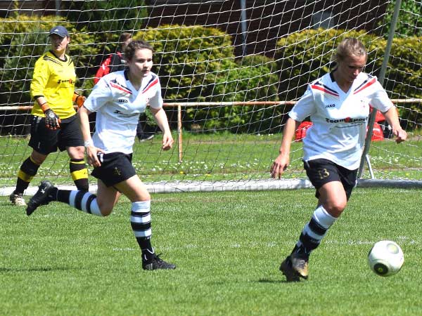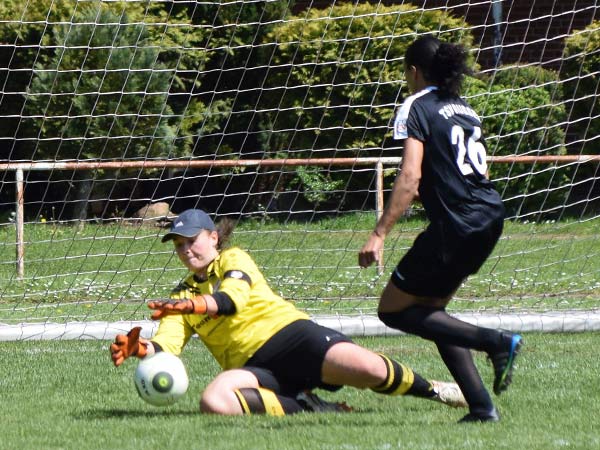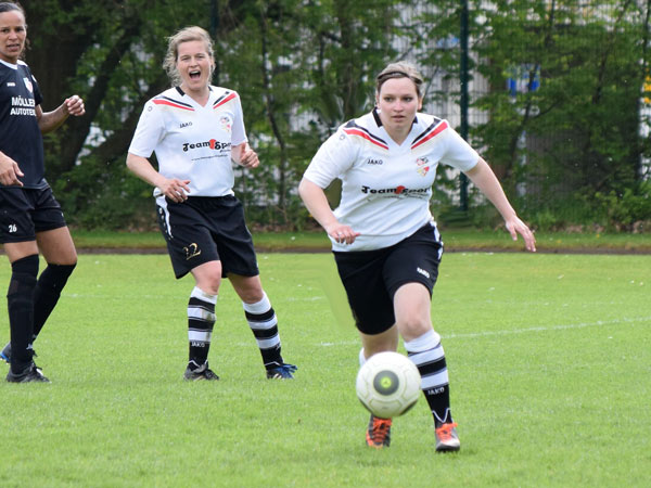 Das Spiel begann nervös, wir mussten etwas umstellen, da sowohl Cathrin als auch kurzfristig krankheitsbedingt Lisa ausfielen. Hannah rückte dafür ins Zentrum und Natalja wirbelte vorne. Nach einiger Abstimmungszeit gelangen uns mehr und mehr Möglichkeiten. Im Ballbesitz agierten wir flexibel und zeigten durchaus Sehenswertes. In der ersten Halbzeit ist es uns gegen die agilen Russeer nicht gut gelungen, gegen den Ball zu arbeiten. Die verdiente Führung fiel dann nach einem schönen Spielzug. Sabeth bringt Natalja per Hacke auf der linken Seite ins Spiel und Natalja mit präziser Flanke auf Lefke – Annahme, Abschluss, Tor – 1:0. Das Ergebnis nahmen wir mit in die Halbzeit und wir wussten, dass wir uns besser organisieren mussten. Gesagt, getan. Wir wurden nun auch selbstbewusster. Viele gelungene Aktionen und ein paar Chancen später hatten wir es Andrea zu verdanken, dass wir den Ausgleich nicht kassierten. Russee kam mit starkem Powerplay und einer riesen Gelegenheit vor unser Tor. Kurze Zeit später machte Hannah es besser und brachte einen Abpraller an der 16-er Grenze im Tor unter. Das 2:0 gab uns die nötige Kraft, bis zum Spielende souverän zu agieren.