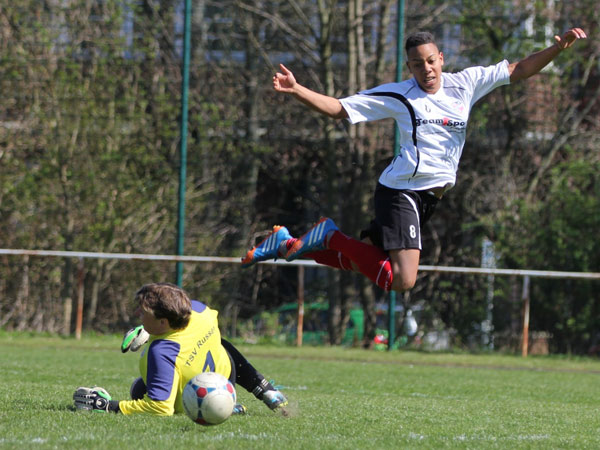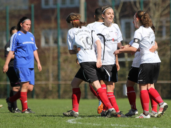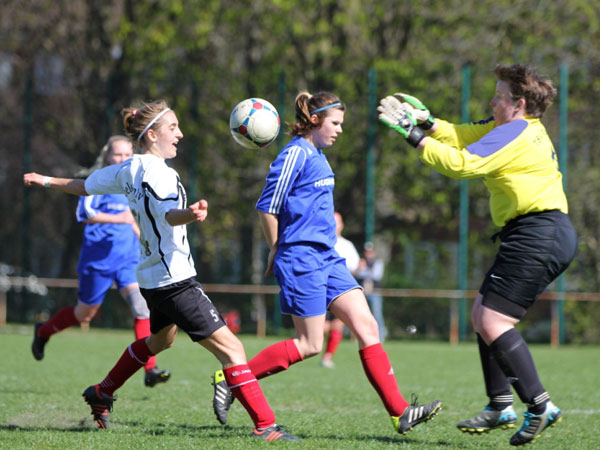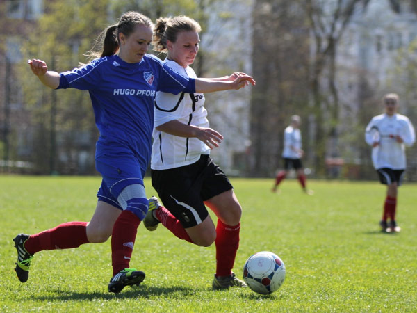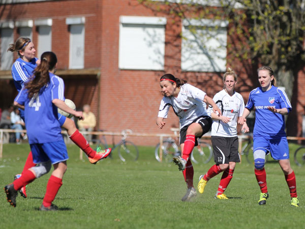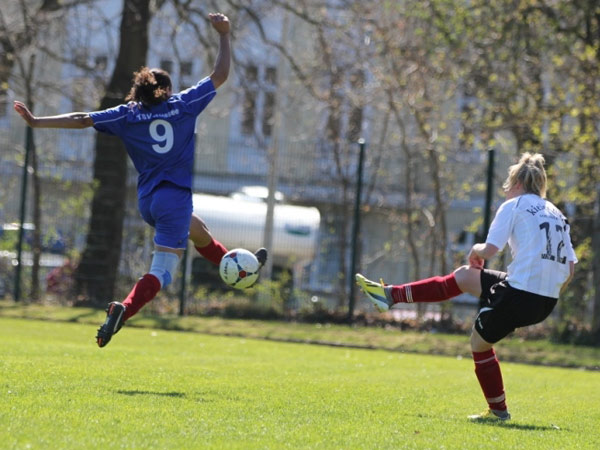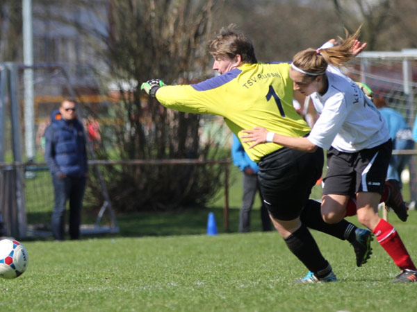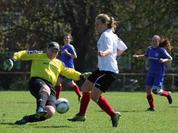 Gleich zu Beginn spürte man den Willen der Gäste, die noch um den Klassenerhalt kämpfen, hier etwas zu bewegen. Leidenschaftlich gingen sie in jeden Zweikampf und wir verpassten es, dem etwas entgegenzusetzen. Ein nicht nachvollziehbarer Freistoß von Eve S. brachte uns den 0:1-Rückstand (18. Minute) ein. Davon wie befreit stürmte Russee weiter in alles, was sich bewegte. Vielleicht waren wir etwas überrascht, aber unbekannt sollte uns diese Spielweise eigentlich nicht sein. Russee legte nach und nutzte einen Abstimmungsfehler zur Flanke. Konsequent köpfte Laura B. den Ball ins Netz (28. Minute). Wir hatten sogar noch Glück, als Katja S. einen Volleyschuss knapp über unser Tor setzte. Wir wollen allerdings auch unsere Offensivszenen nicht unerwähnt lassen. So spielte Nicole in der 23. Minute einen gekonnten Pass in den Fuß von Dorit, doch die Schiedsrichterin wollte hier ein Abseits gesehen haben. Nach einem Freistoß in der 39. Minute bekam Natalja völlig frei im Sechzehner den Ball und verzog denkbar knapp. Kurz vor Ende der ersten Halbzeit kombinierten sich Finja und Nadine über rechts bis an den Strafraum, die Vorlage konnte abermals nicht genutzt werden. So gingen wir mit einem 0:2-Rückstand in die Pause.