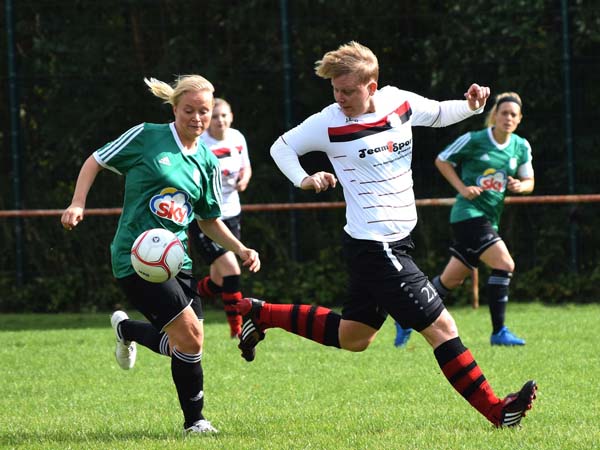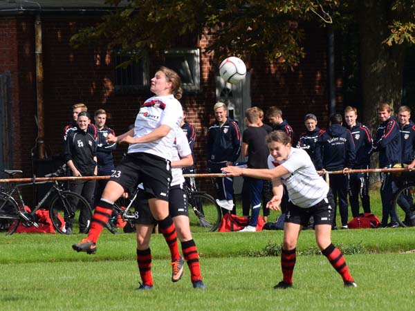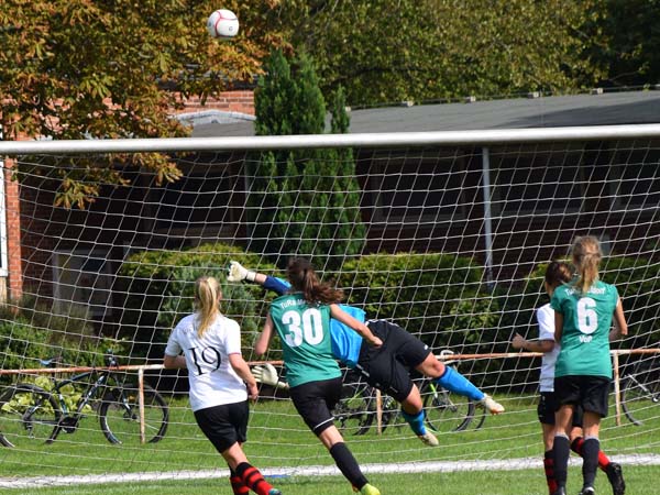 Nach der Pause wollten wir nochmal alles rausholen und Lefke schickte Sandra in den Lauf, die an der Torhüterin vorbeizog und den Ausgleich in der 48. Minute erzielte. Nun ging es Schlag auf Schlag. Andrea parierte drei Großchancen und wir hatten mit Cathrin, Lefke und Sandra ebenfalls drei Gelegenheiten zur Führung. Die Schlussphase hatte es dann in sich. Nadine kommt ins Laufduell mit der gegnerischen Angreiferin und spielt den Ball klar, räumt dann aber die Meldorferin ab (90.). Für den gut postierten Schiedsrichter kein Elfmeter – im Gegenzug dann der Konter zu Sandra, die wieder an der Torhüterin vorbei ist. Diesmal wurde sie allerdings von der Keeperin gehalten und den klaren Elfmeter verwandelte Sandra selbst sicher zum 3:2-Endstand.