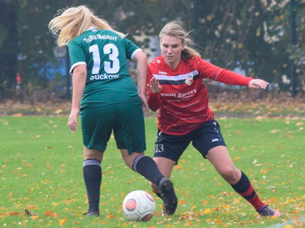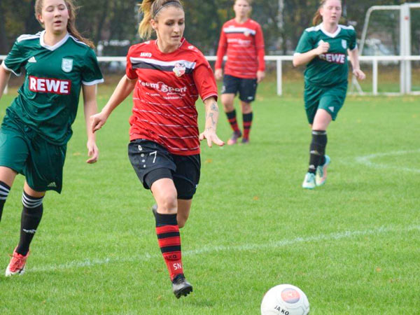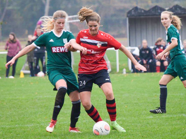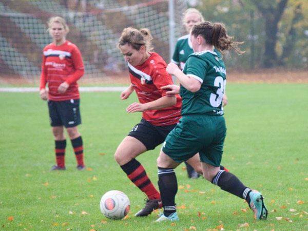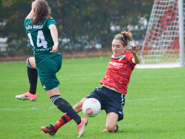 Viel Rotation also, aber sie sollte nicht zu unserem Nachteil sein. Schnell und konzentriert begannen die ersten Minuten. Die erste gute Gelegenheit hatte Nicole auf dem Fuß, als sie alleine Richtung gegnerisches Tor unterwegs war. Leider konnte der Abschluss stark gehalten werden. In der Folge spielten wir teils statisch, aber taktisch sehr diszipliniert. In der 21. Minute setzte sich Nicole über rechts durch und brachte den Ball von der Linie in den Rückraum. Carolin stand bereit und kam im Zweikampf mit der TuRa-Verteidigerin nicht an den Ball. Jedoch war es genügend Druck, dass TuRa selbst den Ball nicht klären konnte und so war es ein Eigentor, das zum 1:0 führte. Wir spielten weiterhin druckvoll und konnten einige Male gefährlich werden. Es sollte bis kurz vor der Pause kein weiterer Treffer fallen, aber dann kam ein klasse Solo von Nicole. Maj leitete den Angriff ein und brachte Nicole ins Spiel, die dann die gegnerische Abwehr spielerisch ausspielte, um schlussendlich auch die Torhüterin zu umkurven. Ein sehenswertes 2:0!