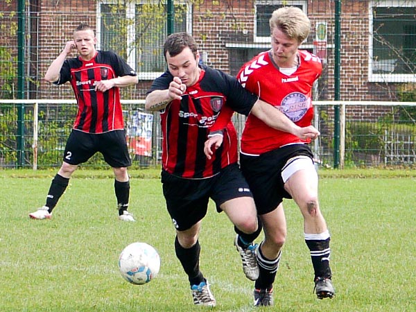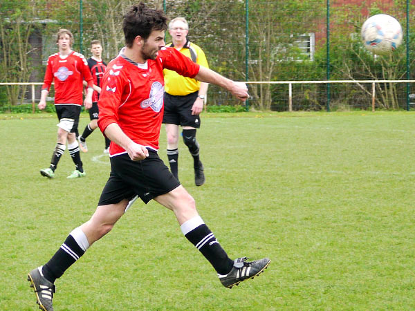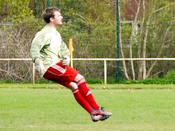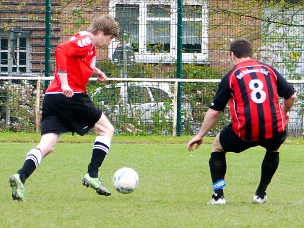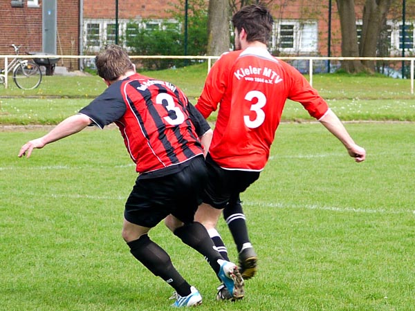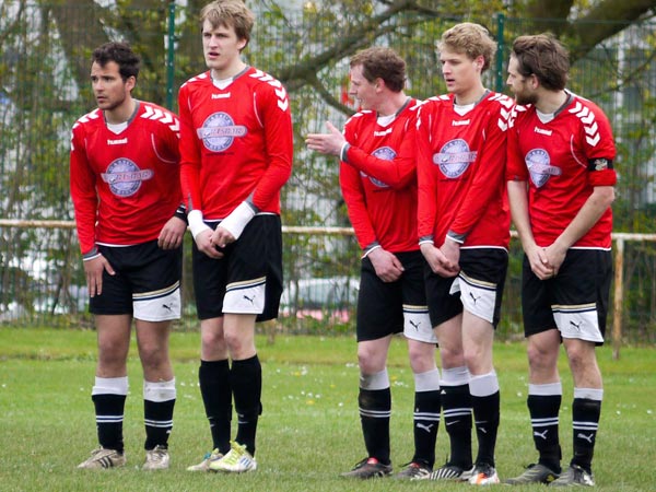 Der Motivationsstand ist unabhängig von der Zahl der Verletzten gegen Rot-Schwarz ohnehin immer hoch. So gings dann auch los - gegen unsere stabile Defensive durfte der Gegner sich die Zähne ausbeißen. "Kompakt stehen" war das Motto des Spiels und es wurde gut umgesetzt. Die hohen Bälle waren keine echte Gefahr. Brenzlig wurde es höchstens bei den ruhenden Bällen, doch der 5er gehörte Henner und die Freistöße gingen neben das Tor. Die Torchancen hatten wir: Kopfball von Janek, 1-2 (ungefährliche) Fernschüsse - und das Tor: Steilpass auf Tilmar, etwas weit, aber gerade noch zu erreichen, Rückpass auf René, scharfe Flanke auf Hans, Kopfball - Tor! Na gut, vielleicht war zum Schluss auch noch ein gegnerischer Abwehrspieler leicht am Ball. Kurz vor der Pause dann noch eine schöne Kombination auf der rechten Seite: Querpass zu Janek, der 25 Meter vor dem Tor den Ball noch anlupft und dann volley aufs Tor schießt - leider war der Torwart so gerade eben noch in der Ecke.
