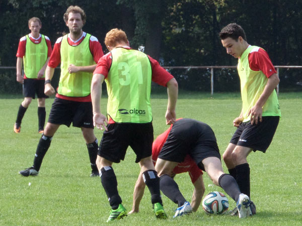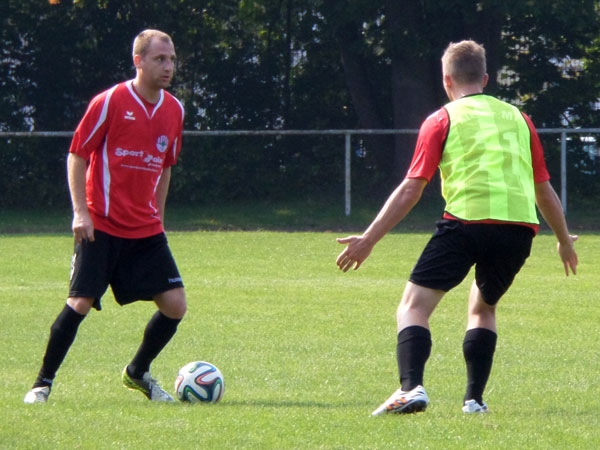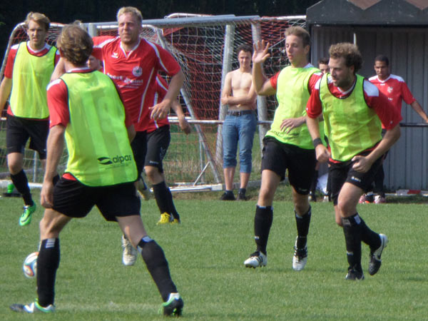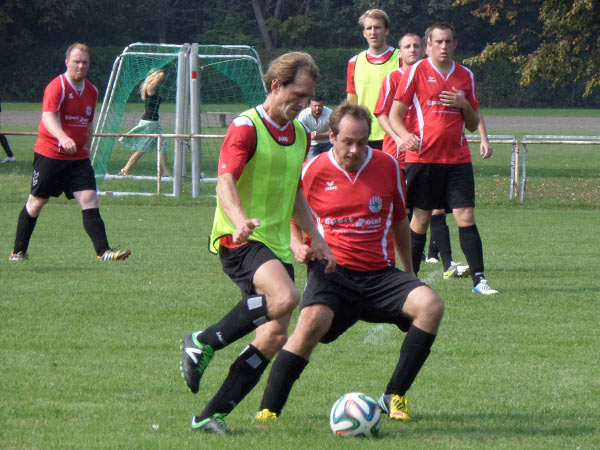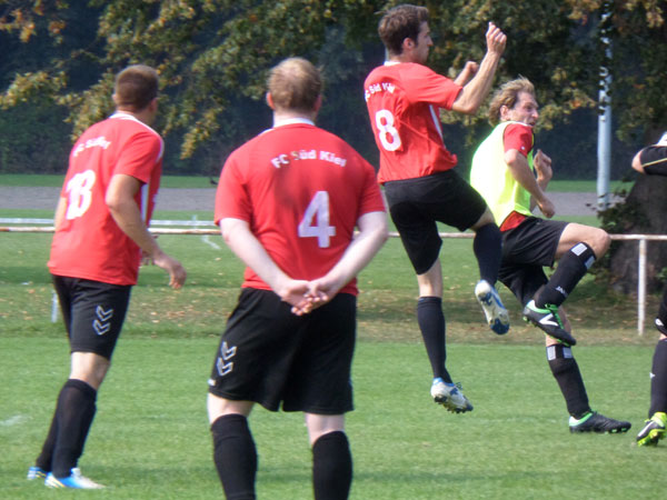 Der KMTV hatte am 6. Spieltag den achtplatzierten FC Süd Kiel 2 zu Gast. In der Anfangsphase drückten die Gäste gefährlich auf das Tor des KMTV, so dass Torwart Daniel M. mit starken Paraden agieren musste, um den KMTV im Spiel zu halten. Nach 15-20 Minuten kam das Team von Daniel Kolibius dann aber besser ins Spiel. Einige Chancen kamen zustande, konnten aber nicht verwertet werden. In der 32. Minute verletzte sich Abwehrspieler Maik S. dann nach einer Abwehraktion mit dem Kopf, so dass er ausgewechselt werden musste. Sein Gegenspieler traf ihn unabsichtlich bei dem Luftkampf im Gesicht. Für Maik kam ein nicht weniger erfahrener Haudegen des KMTV ins Spiel – Nico v. B. Aus dem fälligen Freistoß konnte der KMTV das 1:0 erzielen. Der Freistoß segelte in Richtung Tilmar H., der den Ball elegant runternehmen konnte, in der Drehung zwei Gegenspieler abschüttelte und das runde Leder im Winkel unterbrachte. Eine wahnsinnige Kraftleistung! In der 40. Minute brachte der KMTV dann Christopher H. für Jan K. auf der rechten Außenbahn ins Spiel. Nach dem ersten Tor passierte allerdings nicht mehr viel, so dass es mit dem 1:0 in die Halbzeit ging.