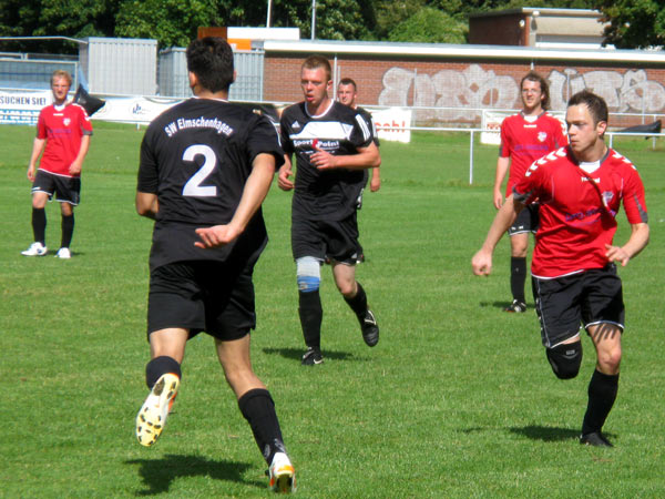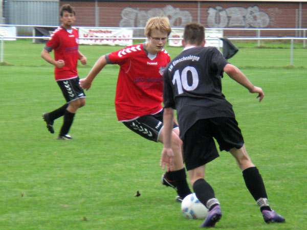 Die zweite Halbzeit gestaltete sich dann ausgeglichener. Wirkliche Großchancen gab es kaum mehr. Dafür aber Tore! Elmschenhagen geht nach einer guten Kombination in Führung, jedoch können wir nur kurze Zeit später ausgleichen. Nach einem sehenswerten Doppelpass von Timo und Daniel auf unserer linken Angriffsseite bringt Timo noch eine scharfe Flanke ins Zentrum, wo Jeff und sein Gegenspieler zum Ball gehen und der Abwehrspieler von Elmschenhagen ins eigene Tor vollendet. Uns gelang in der Folgezeit sogar noch das 2:1 durch Timo, der sich gegen drei Abwehrspieler durchsetzen kann und flach ins lange Eck aus zentraler Position vollendet.