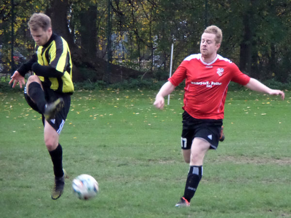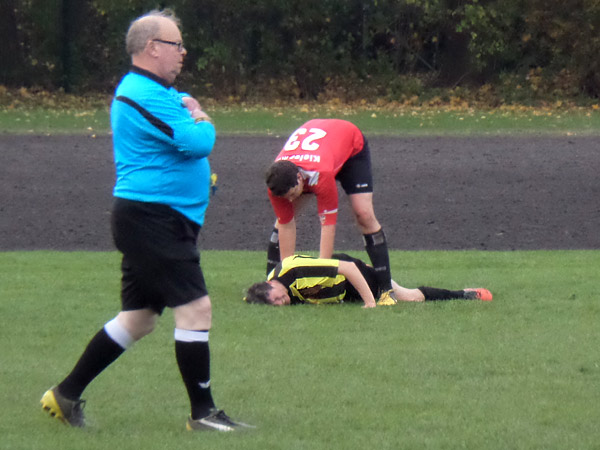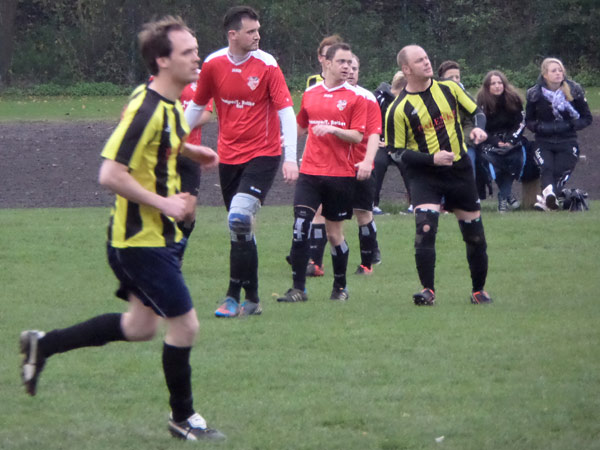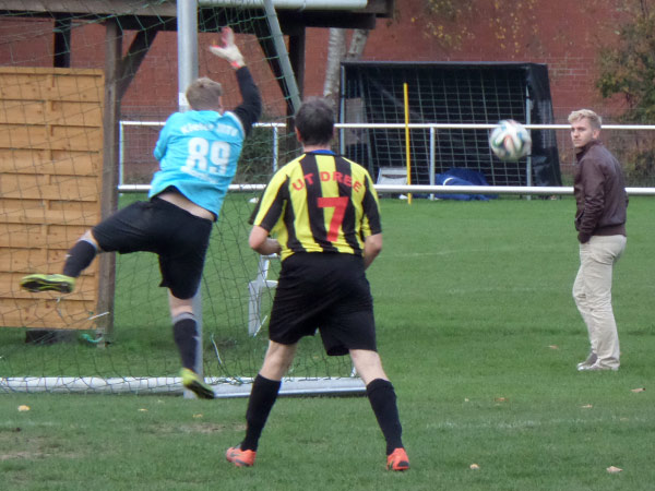 Nach sachlicher Analyse und feuriger Ansprache begann die zweite Halbzeit. Der KMTV wurde nach wie vor mit Angriffen überrollt und konnte sich nur mit dem „langen Hafer“ befreien. Es folgte das Tor des Tages. Auf der linken Seite wurden einige Pässe von UT gespielt, die sich so in gefährlicher Position zum Strafraumeck befanden. Eine Klärungsaktion brachte folglich den Einwurf für UT. Ein Wurf, ein Brustkontakt außerhalb des 16-ers und ein Fallrückzieher überraschtne nicht nur den KMTV, sondern auch die Fans. Der Ball stieg über Martinens Hand und fiel halbhoch in die lange Ecke … Traumtor! Jubel auf der einen Seite, Ernüchterung auf der Seite der Heimmannschaft. Jetzt hieß es: "Arsch hoch und Gras fressen". Es wurde gefightet, geackert, gekämpft, Gras gefressen und (leider auch) getreten. Viele Fouls auf beiden Seiten machten nun das Spiel zu einem Graus. Der Schiedsrichter hatte leider den Überblick verloren, ließ sich anstecken und verteilte gelbe Karten wie die Jecken beim Karneval Kamelle. In der 77. Minute wurde allerdings wieder gefeiert – Tor für den KMTV! Mal wieder war es Kapitän „Dr. Eilich“, der den Ball zunächst einige Meter in die gegnerische Hälfte trieb und seine Mitspieler in der Spitze suchte. Ars G. sowie Timo S. starteten in eine Lücke, wirbelten so ein großes Loch in den 16-er und der Ball wurde butterweich und mustergültig geflankt. Der rote Baron Nille hatte Zeit den Ball kontrolliert anzunehmen und verlud den UT-Keeper erneut. 3:2 KMTV. Danach folgte ein Gänsehautmoment: Nach gefühlter Ewigkeit war es Marco „Jurado“ Rehders, der sein Comeback in einem Heimspiel gab. Die Menge applaudierte. (Wir heißen Marco wieder im Spielerkreis herzlich Willkommen und wünschen ihm eine lange verletzungsfreie Zeit.) Die Partie ging in die Schlussphase, wobei das Chancenplus immer noch auf Seiten der UT-er war. Pfosten und Latte retteten und der UT-Torwart verließ seinen Kasten, um bei den Ecken für die nötige Torgefahr zu sorgen. In der 90. Minute dann der Schlusspunkt: Ecke UT, Befreiungsschlag Dr. Eilich, Tille trieb den Ball ab der Mittellinie in Richtung des leeren Tores und schob lässig zum 4:2-Endergebnis ein.