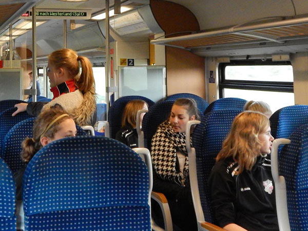 Die lange Anreise nach Niebüll tätigten wir mit dem Zug. So konnten wir unsere vielfahrenden Eltern entlasten und alle gemeinsam Zeit miteinander verbringen. Dachten wir, schon beim letzten Spiel die Fahnenstange der Ausfälle erreicht zu haben, so wurden wir heute eines Besseren belehrt. Nun standen uns nur noch 11 Mädchen zur Verfügung. Karla von den C-Mädchen sprang ein, sodass wir eine Auswechselmöglichkeit hatten. Die erneuten Ausfälle führten wieder zu einigen Veränderungen in der Startelf.
