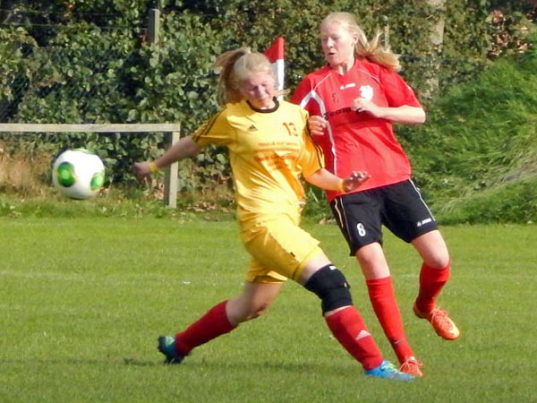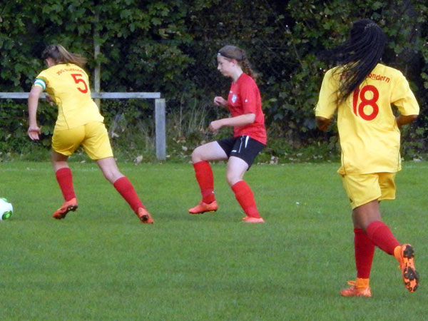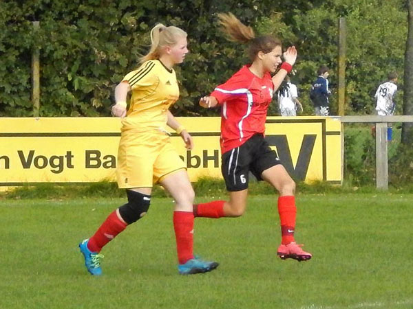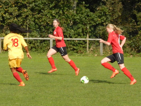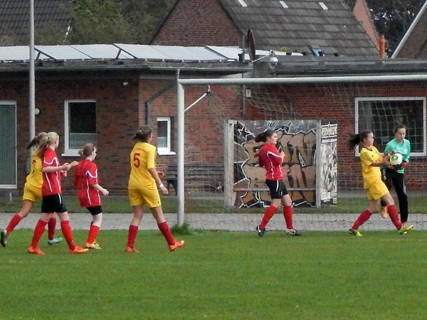 Kaum hatte das Spiel begonnen, lagen wir auch schon hinten. Der erste Angriff der Gastgeberinnen über unsere rechte Seite führte nach einer Flanke zum Tor – da waren wir mit den Gedanken noch nicht auf dem Platz. Der frühe Rückstand tat unserem Spiel nicht gut und wir zeigten uns verunsichert. Besonders im Spielaufbau brachten wir die Heimmannschft immer wieder mit Fehlpässen in Ballbesitz. Heraus kamen einige gute Chancen der Jugendspielgemeinschaft, von denen in der 29. Minute eine zum Tor führte: Wir hatten eine Ecke zentral nicht konsequent klären können und kassierten den Treffer aus 3 Metern Entfernung.