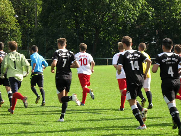 Den besseren Start in die Partie erwischten zunächst die Gastgeber. So sprangen in der 4. und in der 10. Minute nach ordentlichem Offensivpressing zwei Halbchancen durch Dennis und Helmut heraus. Beide Torschüsse verfehlten das Ziel nur knapp. In der 12. Minute dann ein Lapsus eines defensiven Mittelfeldspielers, der dem gegnerischen Stürmer den Ball in den Fuß spielte. Henner konnte glücklicherweise Schlimmeres verhindern. Danach kippte die Partie allmählich in Richtung der Gäste. Die Defensive des KMTV steht in der 17. Minute ein weiteres Mal schlecht und so können zwei Bordesholmer Spieler allein aufs KMTV-Tor zulaufen. Zwar schafft es die Defensive die beiden noch zu stellen, doch den Torabschluss aus 11 Metern kann sie nicht verhindern und so schlägt der Ball im unteren linken Eck zum 0:1 ein. Fünf Minuten später ein ähnliches Bild: Der Gastgeber ist eigentlich wieder im Angriff, doch der Ball geht verloren und landet bei einem Offensivspieler der Gäste. Dieser wird zwar von drei Spielern beschattet, aber nicht angegriffen und so nimmt er sich ein Herz, spaziert durch die Abwehrreihe und schließt mit einem trockenen Schuss in die untere rechte Ecke zum 0:2 ab (22.). In der Folge agierte der KMTV etwas vorsichtiger nach vorne, in der Hoffnung wieder etwas Struktur ins Spiel zu bekommen. Dabei sprang auch eine Chance für Hans in der 27. Minute heraus. Dieser setzte den Ball aus gut 20 Metern leicht über das Tor. Der Kieler MTV steigerte sich in den Folgeminuten und wurde kurz vor der Pause mit dem Anschlusstreffer belohnt. Freistoß von Dennis - der Ball ist hoch und lange in der Luft und findet den allein stehenden Helmut, der den Ball lässig in die Maschen köpft. 1:2 durch unser Kopfballungeheuer. Ein psychologisch wichtiger Treffer kurz vor der Pause!