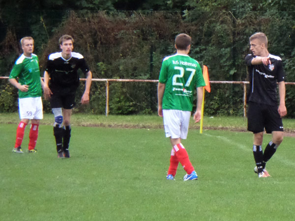 Bereits nach 7 Minuten lag die Heimmannschaft das erste Mal zurück. Nach einem Freistoß von rechts übersehen wir einen Gegenspieler am langen Pfosten, der den Ball unbedrängt in unseren 5er köpft. Zwar können wir diesen Ball noch rausköpfen, doch der Abwehrversuch gerät zu kurz und so bedankt sich der Spieler von Holtenau und schießt das zum 0:1 Ding rein.