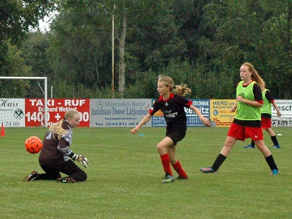 Das "Lazarett" hatte sich im Vergleich zur Vorwoche gelichtet, so dass wir mit 12 Mädchen nach Wentorf fahren konnten. Hier kamen wir aber erst 35 Minuten vor Spielbeginn an, was zu einem verkürzten Aufwärmprogramm führte. Der Platz war wie vorgeschrieben von Strafraum zu Strafraum aufgebaut, doch die Breite hatte man um 10 Meter auf sehr schmale 40 Meter verringert, weil die Heimmannschaft dies bei ihrem ersten 9er Spiel so wünschte.