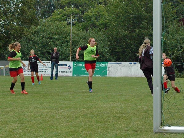 In der zweiten Hälfte wechselte Joana aus dem Tor. Für sie ging Lea zwischen die Pfosten. Wir wollten nun die schnelle Entscheidung, rannten uns aber zunächst in der gegnerischen Deckung fest. In der 47. Minute setzte sich Justina auf halblinks durch und schoss bedrängt aus 15 Metern aufs Tor. Die Torhüterin wehrte per Fußabwehr nach außen ab, wo der Ball liegen blieb. Die nächste Abwehrspielerin und die Torhüterin verließen sich beide aufeinander und keine bewegte sich Richtung Ball. Diese Situation erkannte Luna und ersprintete sich das Leder knapp vor der nun doch herauseilenden Torfrau. Aus sehr spitzem Winkel schob sie den Ball ins leere Tor. Danach verflachte die Partie. Wir kontrollierten zwar jederzeit das Geschehen, doch kamen kaum noch Möglichkeiten für uns heraus. Den für sie wohl langweiligsten Part hatte Lea im Tor mit zwei Ballberührungen in der Halbzeit.