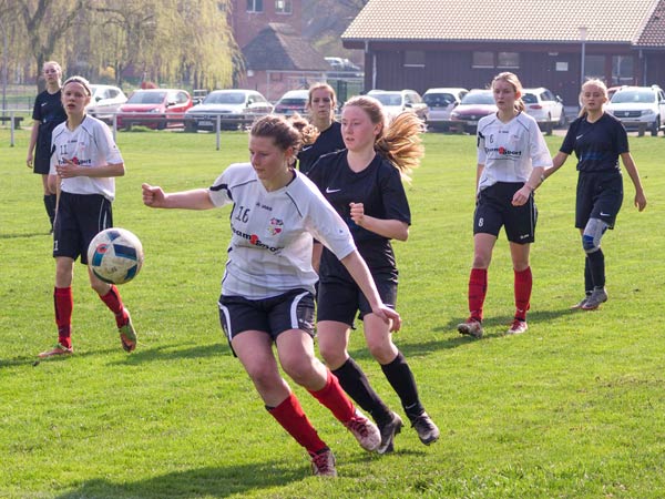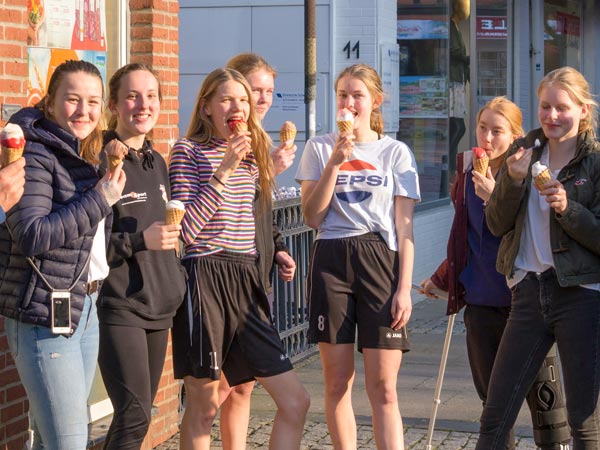 Im zweiten Durchgang reduzierte der Gegner auf 9 Mädchen, so dass wir nur noch in einfacher Unterzahl mit 9 gegen 8 das Großfeld bespielen mussten. Wir hatten schon so viel Substanz gelassen, dass an ein Drehen der Partie nicht zu denken war. Die Partie verlief nun aber weitgehend ausgeglichen. Wir versuchten weiterhin auch vorwärts alles, doch ein Tor wollte uns nicht gelingen. Der Gegner konnte noch zwei Treffer erzielen, so endete das Match mit einem guten 0:7 gegen uns. Nach dem Spiel machten wir eine Eisdiele in Bad Oldesloe unsicher. Das hatten sich alle verdient.