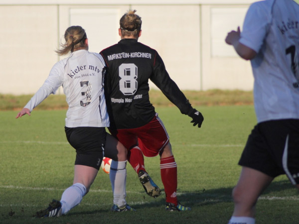 der Neumünsteraner Spielerin schmerzhaft zu spüren, als diese Mareike den Ball in den Bauch tritt.