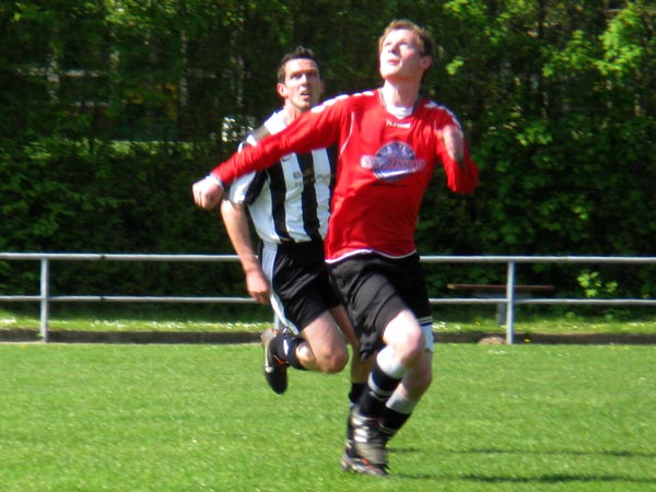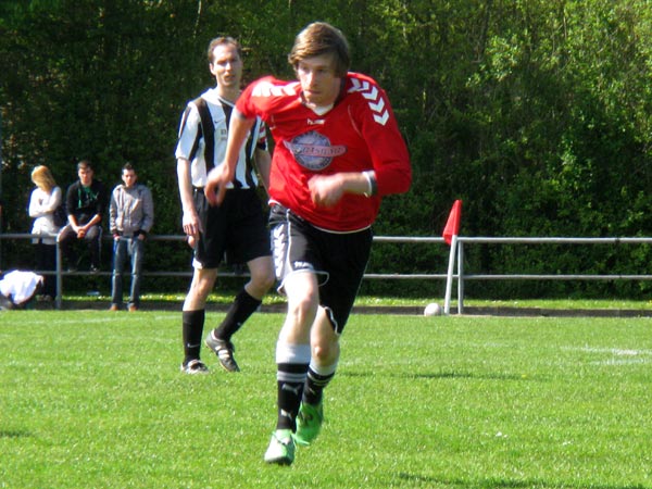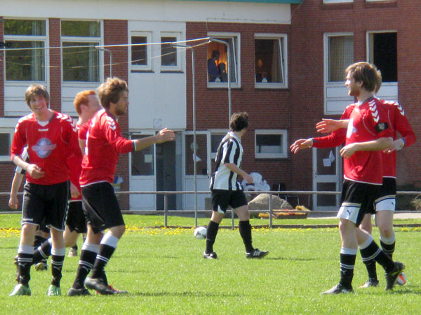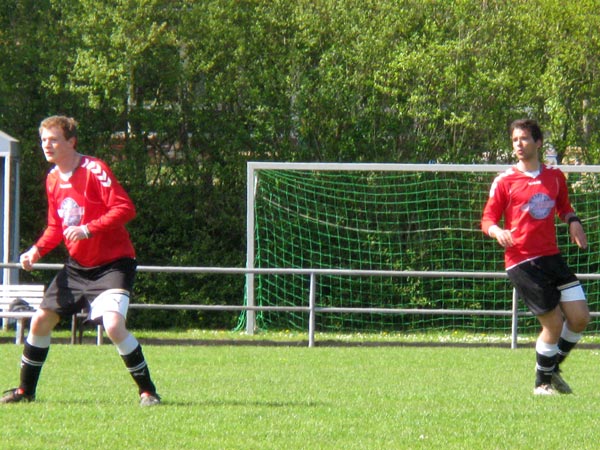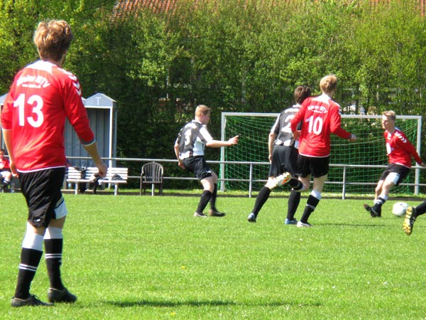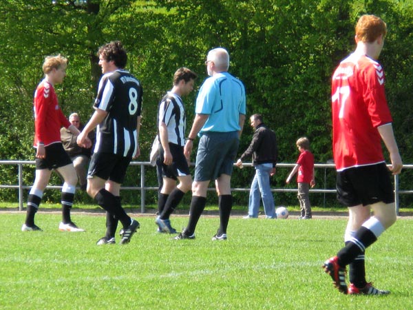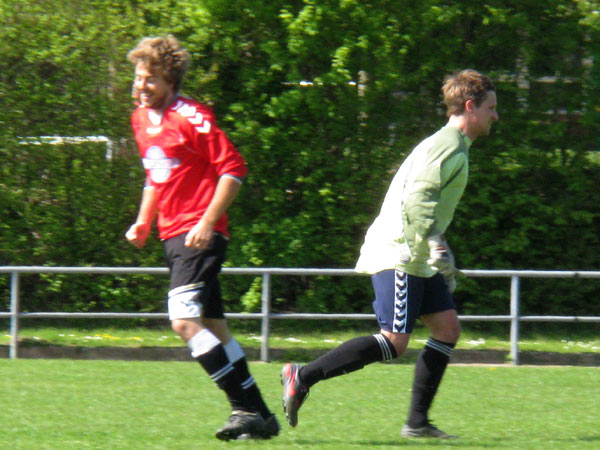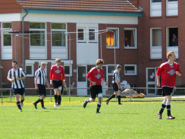 Hier noch ein paar Details: Wir hatten das Spiel zu Beginn klar im Griff und haben auch schön kombiniert. Nach zwei Minuten gingen wir nach einem schönen Pass von Hans in den freien Raum und einem per Lupfer erzielten Treffer von Tom in Führung. Nach dem Tor blieben wir dran und hatten die Gelegenheit die Führung auszubauen. Etwa zur Mitte der ersten Halbzeit begann Dänischenhagen sich aber ins Spiel reinzukämpfen und wurde mit zunehmender Spielzeit gefährlicher. Die Konsequenz war dann der Ausgleich nach einem schnell ausgeführten Freistoß, bei dem wir nicht ganz wach und daher ungeordnet wirkten.