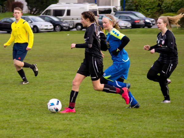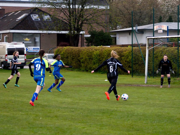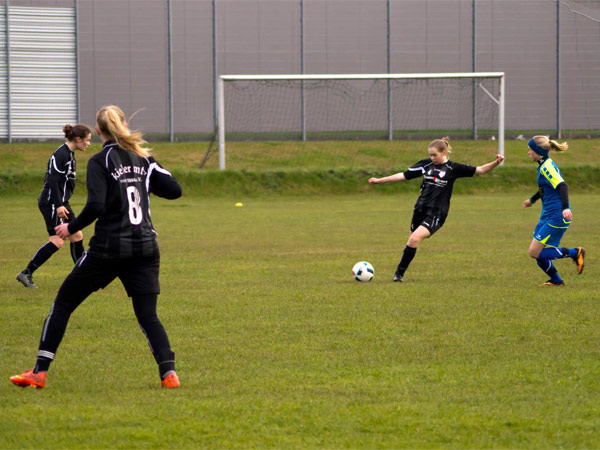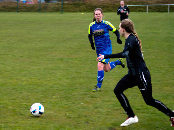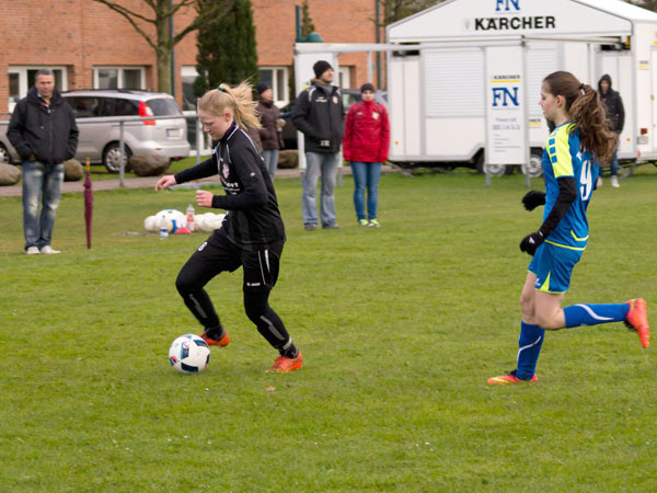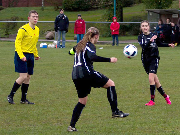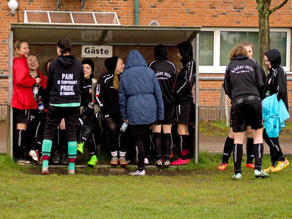 Nachdem es den ganzen Tag heftige Schnee- und Regenschauer gegeben hatte, rechneten wir mit einer Spielabsage. Da wir endlich mal wieder personell mit 14 Spielerinnen gut aufgestellt waren, wäre dies schade gewesen. Zu aller Überraschung konnte der PTSK-Rasen doch bespielt werden. Dies war umso bemerkenswerter, weil die Gastgeberinnen nur 10 Mädchen auf dem Spielberichtsbogen hatten.