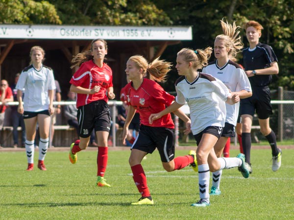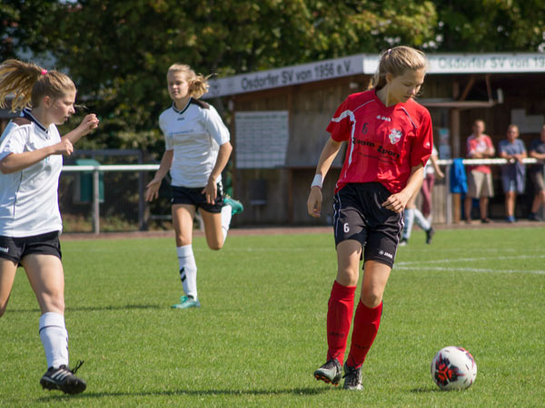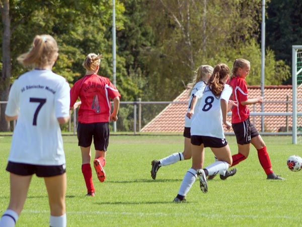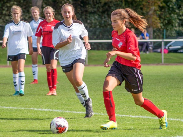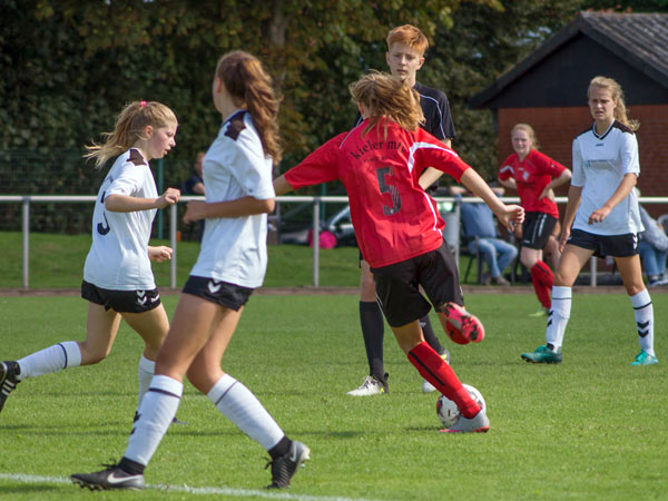 Wir wollten heute hoch stehen und viel Offensivdruck erzeugen. Das gelang uns sehr gut und wir übernahmen sofort die Initiative. Nach elf Minuten gingen wir auch schon in Führung. Laura setzte sich über außen durch und bediente von der Grundlinie Clara, die einschoss. Nur sieben Minuten später mussten wir den Ausgleich hinnehmen. Wir kamen an einen weiten Schlag im Zentrum nicht ran und eine gegnerische Stürmerin ließ sich allein vor dem Tor die Chance nicht entgehen. Vier Minuten später dann der nächste Aufreger: Bei einem schnellen Konter spitzelte Kim in letzter Sekunde einer Gegnerin den Ball vom Fuß. Der Schiedsrichter sah dabei ein Foul und nach dem anschließenden Elfmeter lagen wir hinten. Weiter machten wir das Spiel und konnten in der 29. Minute endlich wieder eine Chance verwerten. Saskia beförderte aus kurzer Entfernung den Ball ins Tor. Vor der Pause gingen die Gastgeberinnen wieder in Führung. Wir konnten einen steilen Pass in die Spitze nicht verteidigen.