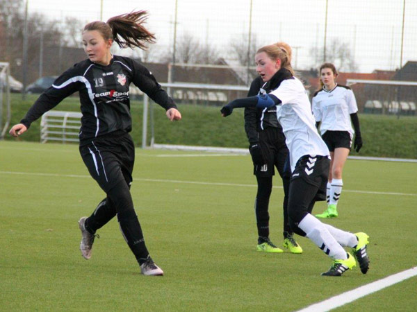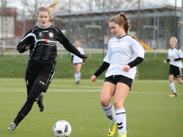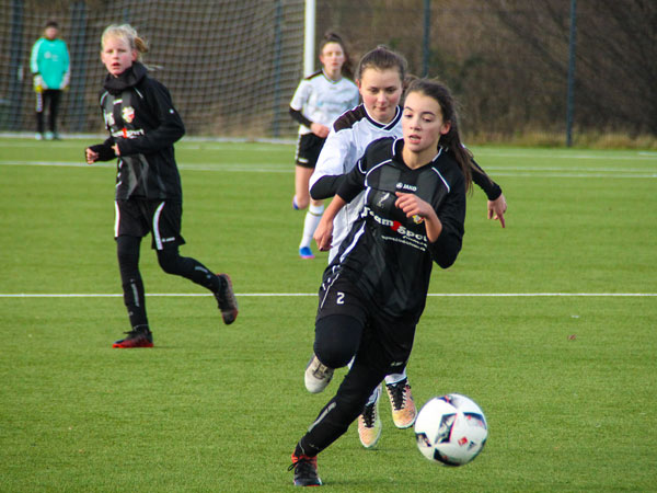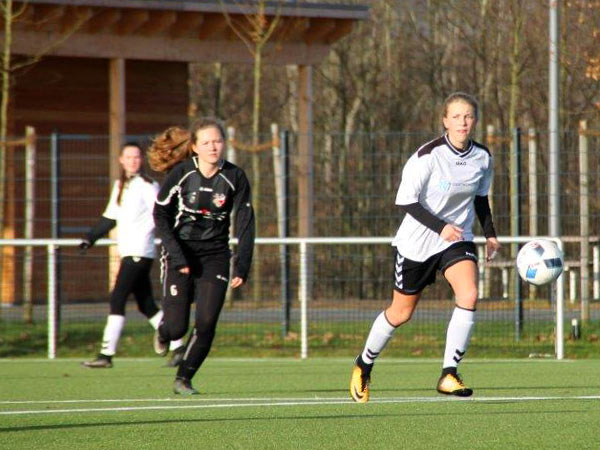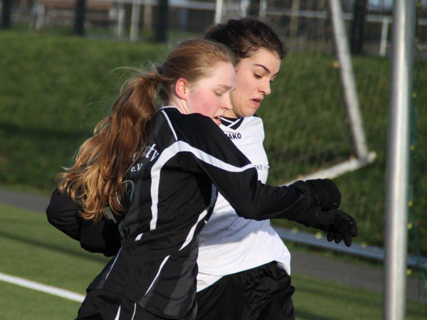 Von Beginn an waren wir das aktivere Team und hatten ein spielerisches Übergewicht. In der 12. Minute gingen wir dann auch folgerichtig in Führung. Annika spielte den Ball am Strafraum quer auf Amelie, die sofort abzog und traf. Auch danach blieben wir die tonangebende Mannschaft, kamen aber immer um eine Fußbreite zu spät oder brachten den letzten Pass nicht ins Ziel. Wie aus dem Nichts fiel acht Minuten vor der Halbzeit mit dem ersten Schuss auf unser Tor der Ausgleich. Nach einer Ecke kam eine Gegnerin an der Strafraumgrenze eher an den Ball und chippte ihn direkt hoch vor unser Tor. Dieser Ball senkte sich sehr unglücklich über Nele ins Tor. Und es kam noch schlimmer: In der Nachspielzeit gingen die Gastgeberinnen mit ihrem zweiten Torschuss sogar in Führung.