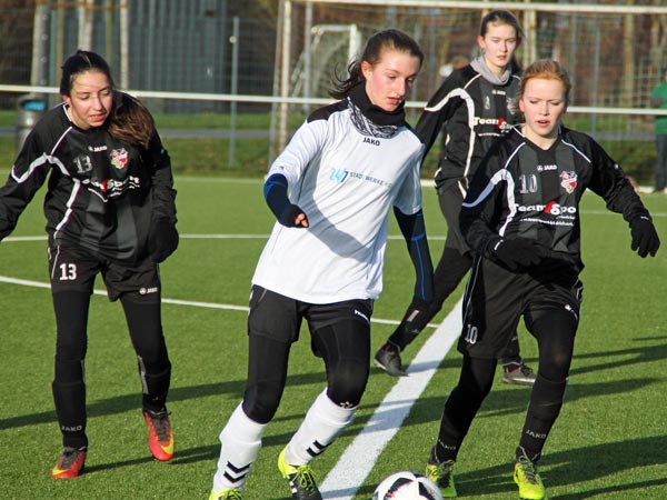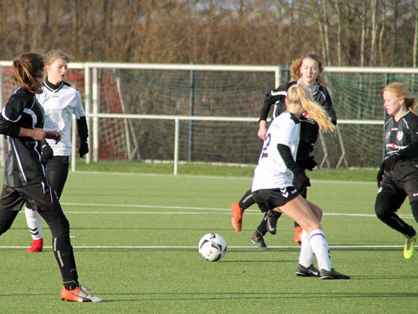Das kalte Winterwetter forderte seinen Tribut und wird hatten zahlreiche gesundheitliche Ausfälle zu beklagen. Deshalb konnten wir trotz Aufstockung mit C-Mädchen nur mit 12 Spielerinnen nach Gettorf reisen. Auf Kunstrasen stand damit unser jüngstes Team der bisherigen Saison mit sechs B-Mädchen und sechs C-Mädchen auf dem Platz.